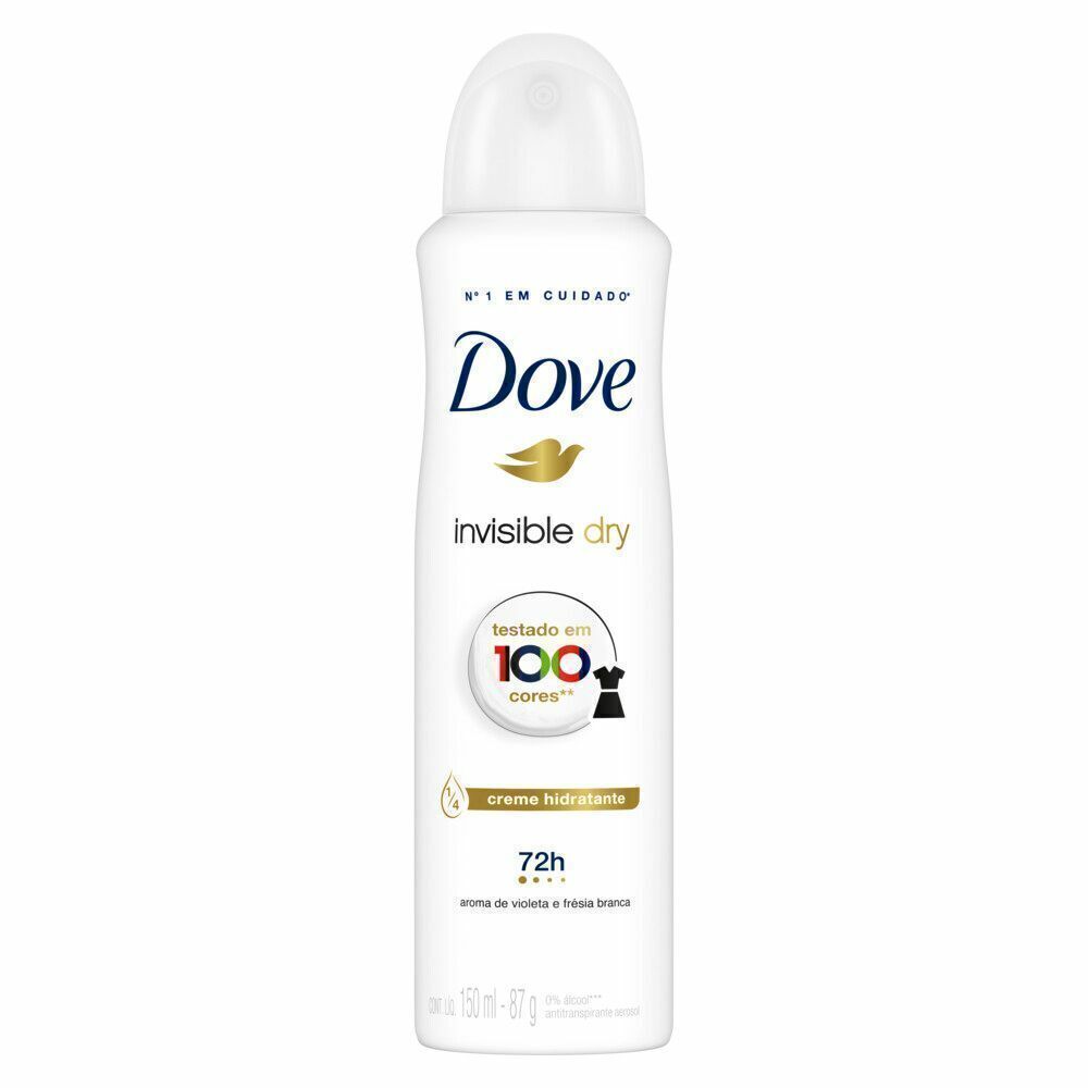 o O Desodorante Antitranspirante Aerosol Dove Invisible Dry não deixa manchas brancas nas roupas, testado em 100 cores** de tecidos o Com tecnologia superior, o antitranspirante Dove garante proteção contra o suor e mau odor por até 72h, dando uma sensação de limpeza e frescor o Dove Invisible Dry é um desodorante antitranspirante sem álcool*** em sua fórmula, que cuida das suas axilas e das suas roupas o Este desodorante aerosol de rápida absorção e delicado para suas axilas é o número 1 em cuidado* para a sua pele o Contém 1/4 de creme hidratante e vitamina E, além de uma agradável fragrância de violeta e frésia branca o Dove não realiza testes em animais, sendo certificada como Cruelty-Free pela PETA. Este aerosol é vegano, não danifica a camada de ozônio e nossas latas são feitas de metal reciclável