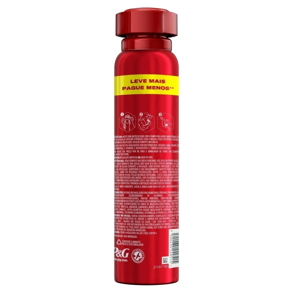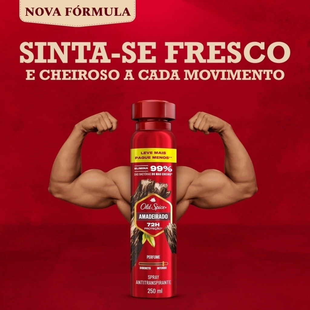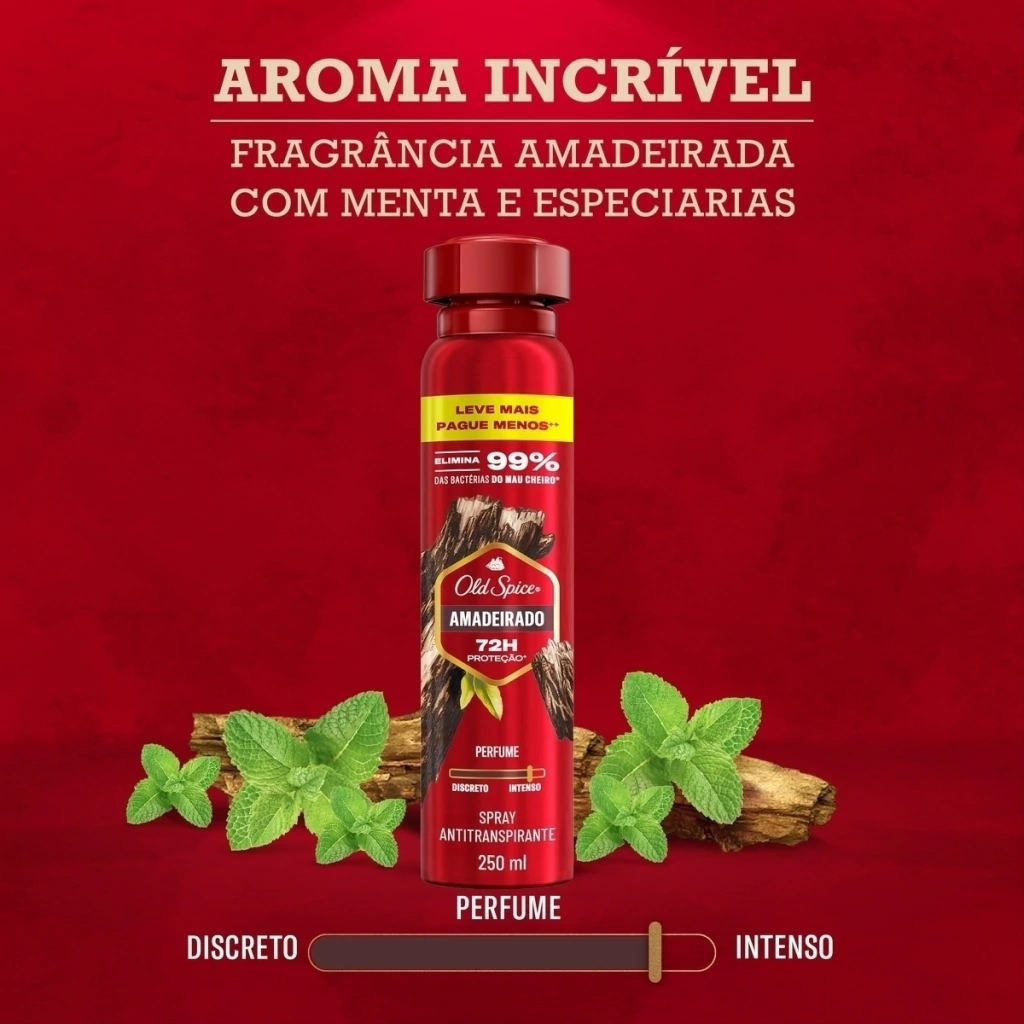 Novo Old Spice 250ml.Leve mais, pague menos*.Descubra o desodorante antitranspirante em spray Old Spice Amadeirado! Sinta-se mais confiante e protegido contra o suor e o mau cheiro, com o seu incrível aroma amadeirado com menta e especiarias.*Com base em preço por ML para a embalagem de 150ml em comparação a embalagem de 250ml.o Elimina 99% das bactérias do mau cheiro*o 72 horas de proteção contra o mau cheiroo Sensação de frescor duradouroo Aroma amadeirado com menta e especiariaso Você longe do cheiro de cecê ou suor o Dura até 20 días**o *Baseado em testes realizados com bactérias que causam o mau odor corporal: S. EPIDERMIDIS, S. HOMINIS, C. MUCIFACIENS, C. TUBERCULOSTEARICUM. o **com base na instruçao de uso para 4.4g por día