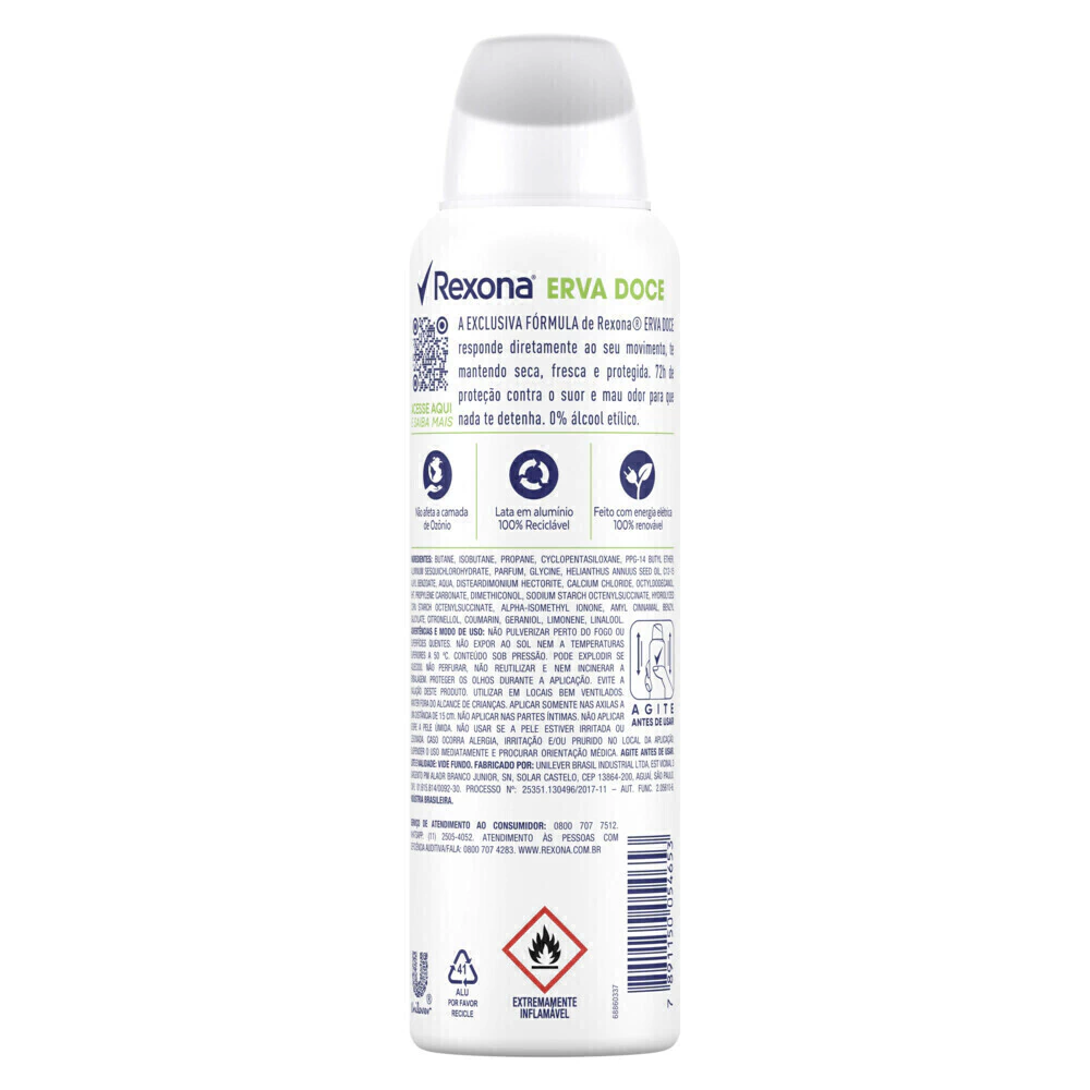 A nova e exclusiva fórmula de Rexona Erva Doce trabalha com um sistema de partículas menores e mais estáveis que formam uma barreira protetora mais resistente e duradoura contra a transpiração e o mau odor, mantendo você seco, fresco e protegido a cada novo movimento e por muito mais tempo. Sua fragrância de erva doce é suave e fresca, garantindo a sensação de frescor durante o dia inteiro. . 0% álcool*. (*) Não contém álcool etílico.