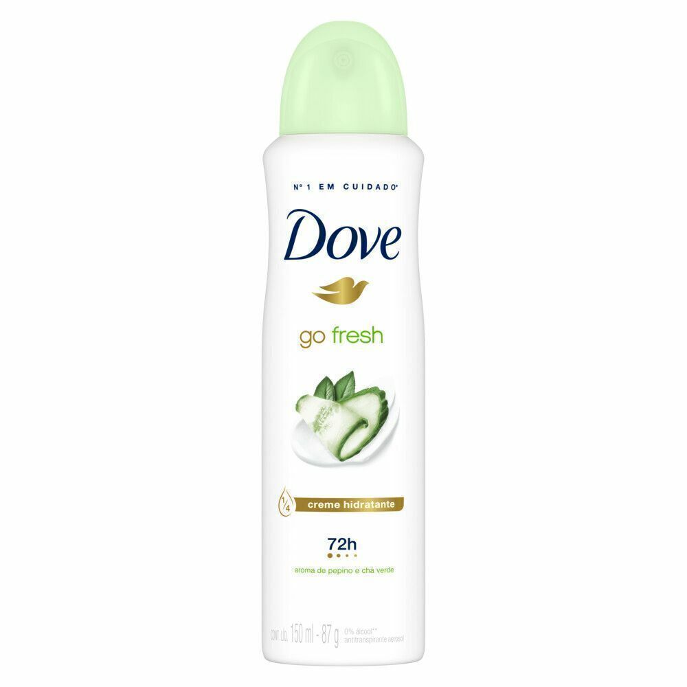o O Desodorante Antitranspirante Aerosol Dove Go Fresh Pepino e Chá Verde possui uma deliciosa e refrescante fragrância que dura o dia todo o Com tecnologia superior, o antitranspirante Dove garante proteção contra o suor e mau odor por até 72h, para uma sensação de limpeza e frescor revitalizante o Dove Pepino e Chá Verde é um desodorante antitranspirante sem álcool** em sua fórmula o Este desodorante aerosol de rápida absorção e delicado para suas axilas é o número 1 em cuidado* para a sua pele o Contém 1/4 de creme hidratante e vitamina E, além de uma agradável fragrância de pepino e chá verde o Dove não realiza testes em animais, sendo certificada como Cruelty-Free pela PETA.