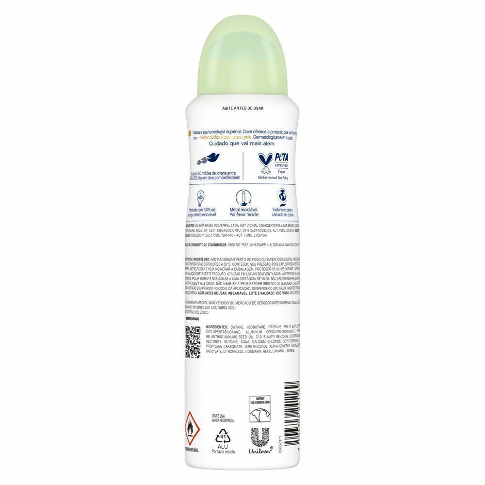 Este aerosol é vegano, não danifica a camada de ozônio e nossas latas são feitas de metal reciclável Número 1 em cuidado*, o Desodorante Antitranspirante Aerosol Dove Go Fresh Pepino e Chá Verde é o preferido das nossas consumidoras. Feito com tecnologia superior, ele cuida e protege das axilas por 72 horas contra suor e mau odor, mantendo as axilas secas o dia todo. Formulado com 1/4 de creme hidratante e vitamina E, ajuda a manter a hidratação da pele das axilas, deixando-a suave e macia. O desodorante Dove Go Fresh é sem álcool** e gentil com sua pele. Além de proteger contra suor e mau odor, possui uma fragrância de pepino e chá verde, oferecendo uma sensação de limpeza e frescor revitalizante. Dove proporciona proteção eficaz e cuidado para a pele das axilas, para que você possa se libertar de qualquer desconforto e se sentir confiante o dia todo. Para uma melhor proteção contra marcas de suor e irritação da pele, siga estas dicas: após o banho, garanta que as axilas estão bem secas; para obter o máximo do seu Desodorante Antitranspirante Aerosol Dove Go Fresh Pepino e Chá Verde, agite a embalagem para ativar os ingredientes; segure-a voltada para cima a 15 cm das suas axilas e aplique um jato de dois segundos em cada uma. Dove é certificada Cruelty-Free pela PETA, sendo assim, não realizamos e nem realizaremos testes em animais em nenhum lugar do mundo. Além disso, nosso antitranspirante é vegano, fabricado com energia elétrica 100% renovável, nossa lata é feita de metal reciclável e o produto não danifica a camada de ozônio. *Antitranspirante Aerosol mais vendido do mercado de desodorantes no Brasil (Nielsen Retail Index INA+INFC, Novembro 2021 a Outubro 2022). **Não contém álcool etílico.