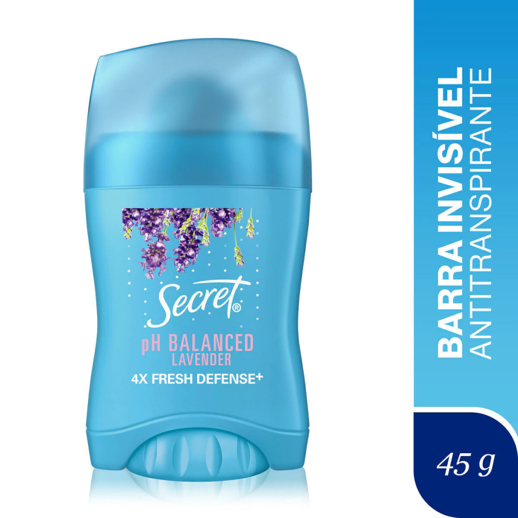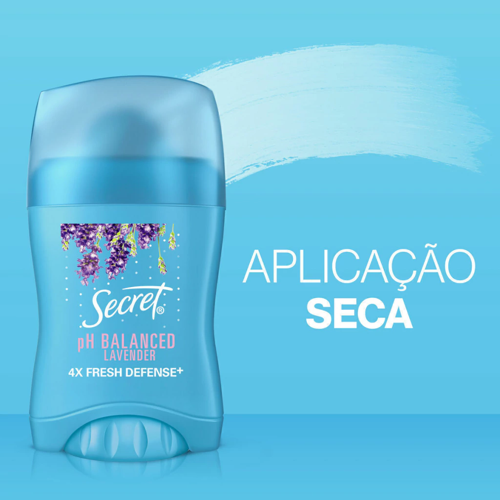 Além disso, Secret é uma marca livre de crueldade animal certificada pela PETA. o Antitranspirante invisible em barra com TECNOLOGIA 4X FRESH DEFENSE que protege você contra o suor e o mau cheiro o Tecnologia com cápsulas ativas, reage repetidamente encapsulando e neutralizando o mau cheiro e ajudando a eliminá-lo o Proteção com um pH balanceado que trabalha com a química natural do seu corpoo Aroma suave e relaxante de lavanda