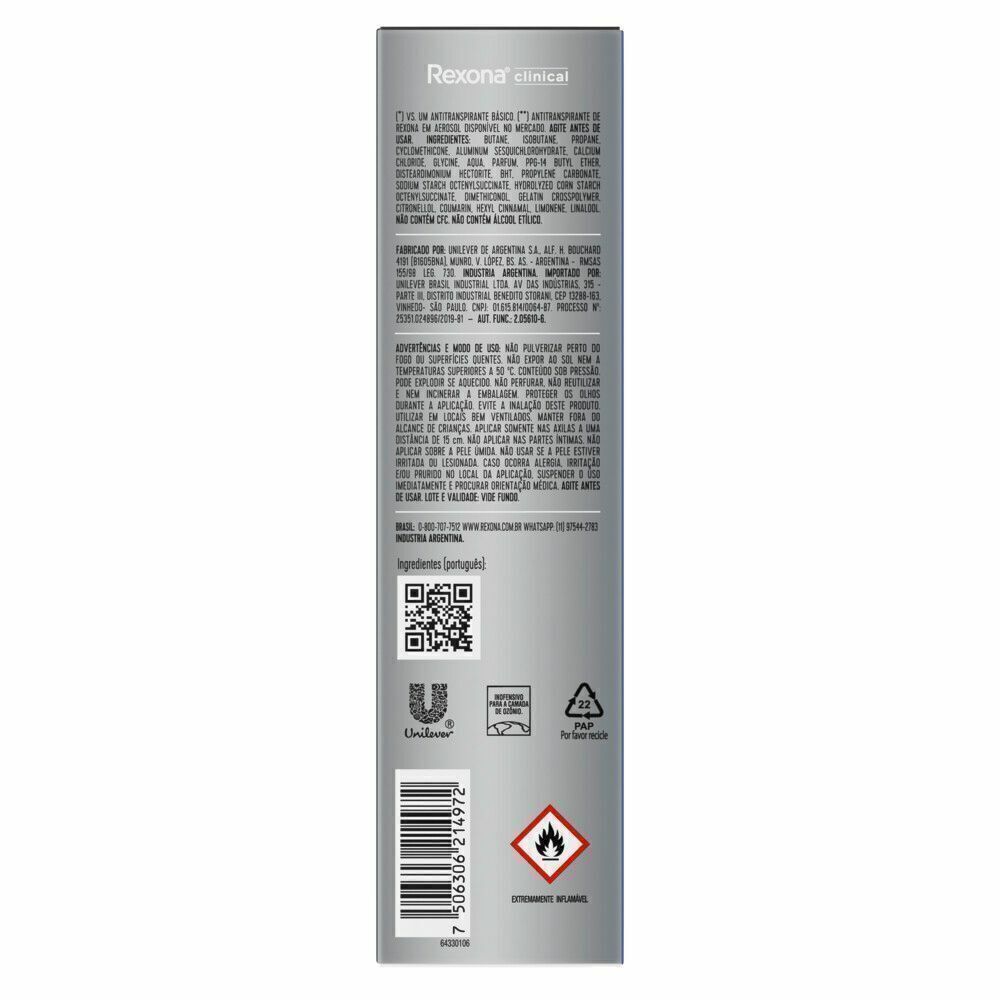 o O Desodorante Antitranspirante Rexona Men Clinical Clean garante 96 horas de proteção contra suor e mau odor o Esse antitranspirante protege 3x mais contra a transpiração excessiva* e odor corporal que um antitranspirante comum o O Desodorante Rexona é um aerosol de alta performance com secagem rápida o A fórmula de Rexona Men Clinical garante máxima proteção e não deixa manchas** nem marcas em suas roupas o Desodorante aerosol com uma textura leve e um perfume agradável, fácil de aplicar, para que se sinta sempre seco e limpo o Rexona Men Clinical Clean está disponível no formato desodorante em creme ou aerosol