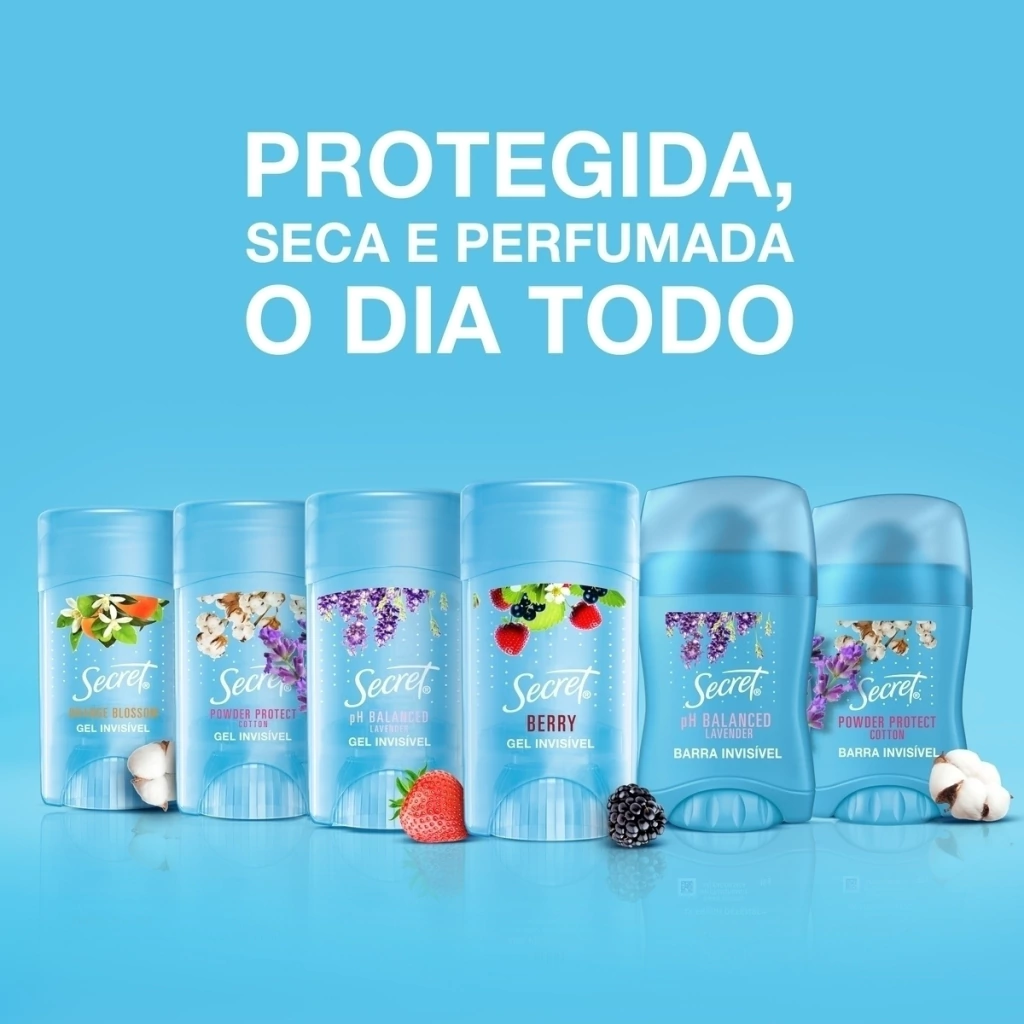 o SUAVE AROMA DE FRUTAS VERMELHAS. Protegida, seca e perfumada todo o dia com a proteção contra o suor e mau odor que o desodorante antitranspirante Secret em gel te oferece o APLICAÇÃO TRANSPARENTE. Te protege instantâneamente antes que você comece a suar e o melhor: É anti-manchas*! *Manchas brancas nas roupas na aplicação o LIVRE DE CRUELDADE ANIMAL: Secret é uma marca livre de crueldade certificada pelo PETA o MODO DE USO. Se aplica diretamente na pele, sem disperdícios no ar. Retire o selo de segurança, use 2-3 clicks por axila, aplique diariamente, somente nas axilas e deixe a embalagem bem fechada o SOBRE SECRET. Desde 1956, Secret vem ajudando mulher a brilhar trazendo o melhor de si mesma, proporcionando uma incrível proteção contra o mau odor e refrescância o dia todo