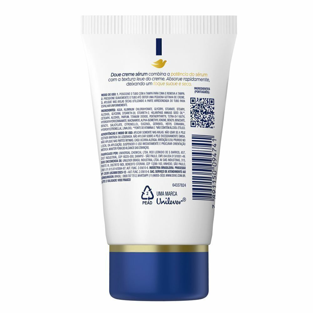 oO Desodorante Antitranspirante Dove Creme Sérum Reparação Diária possui fórmula suave e hipoalergênica, a escolha ideal para peles sensíveis oDesodorante Antitranspirante com proteção de 48h contra o suor e mau odor e sem álcool oCom ¼ de creme hidratante e vitamina E, a fórmula exclusiva desse desodorante antitranspirante combina os benefícios do sérum concentrado com a textura leve do creme oO Desodorante Creme Sérum Reparação Diária é ainda mais prático de aplicar graças ao seu aplicador de contato, direto nas axilas oEste desodorante traz toque seco às axilas com uma fragrância confortável oSó Dove desodorante cuida, protege e repara a pele das axilas desde o primeiro uso