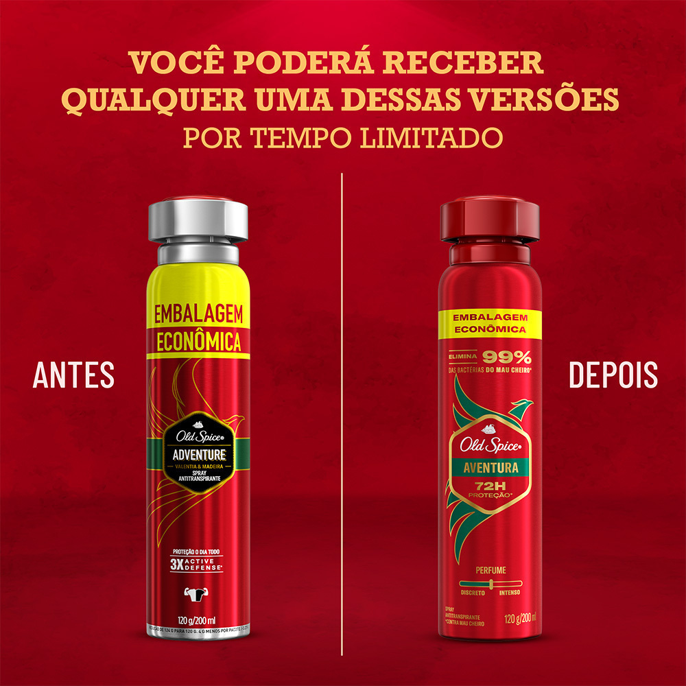 Esteja pronto para novas aventuras com o desodorante antitranspirante em spray Old Spice Aventura! Sinta-se revigorado e protegido contra o suor e o mau cheiro, graças à poderosa fragrância que combina a robustez da madeira com a energia dos cítrico e ervas frescas. E ainda, garanta o menor preço por ML de Old Spice.**Com base em preço por ML para a embalagem de 150ml em comparação a embalagem de 200ml.