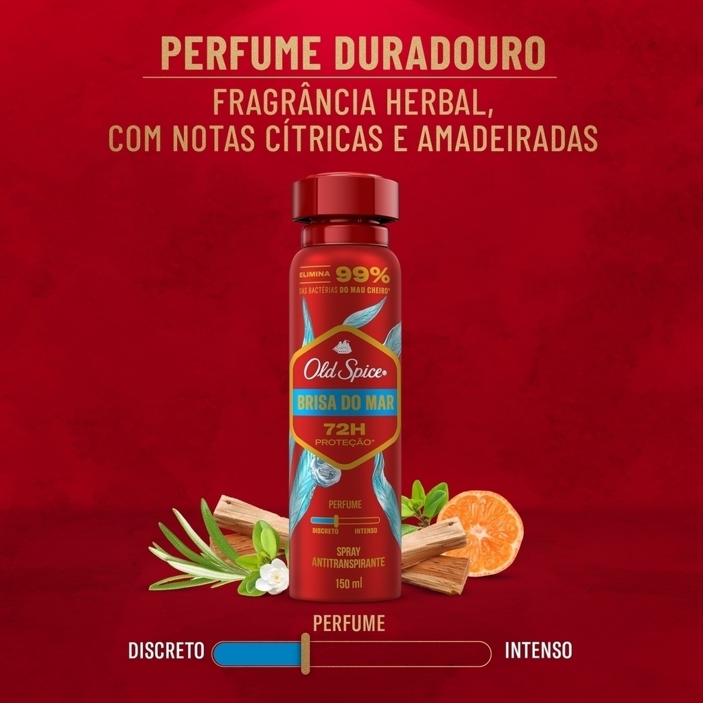 Aproveite mais refrescância e proteção contra o suor e o mau cheiro com o desodorante antitranspirante em spray Old Spice Brisa do Mar! Conte com uma poderosa fragrância herbal, com notas cítricas e amadeiradas.o Elimina 99% das bactérias do mau cheiro**Baseado em testes realizados com bactérias que causam o mau odor corporal: S. EPIDERMIDIS, S. HOMINIS, C. MUCIFACIENS, C. TUBERCULOSTEARICUMo 72 horas de proteção contra o mau cheiroo Sensação de frescor duradouroo Fragrância herbal, com notas cítricas e amadeiradaso Você longe do cheiro de cecê ou suor o Dura até 20 días****Com base na instruçao de uso para 4.4g por día
