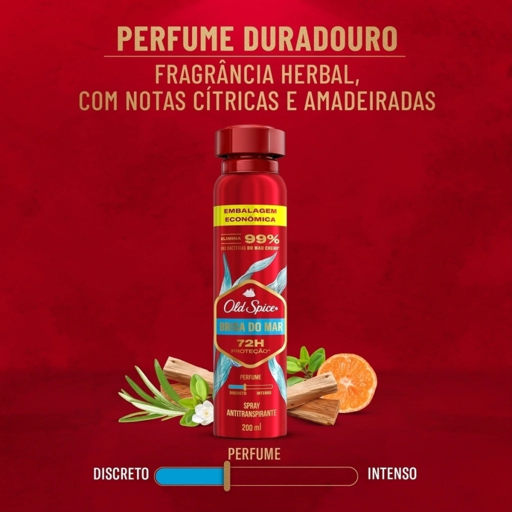 Aproveite mais refrescância e proteção contra o suor e o mau cheiro com o desodorante antitranspirante em spray Old Spice Brisa do Mar! Conte com uma poderosa fragrância herbal, com notas cítricas e amadeiradas. E ainda, garanta o menor preço por ML de Old Spice.**Com base em preço por ML para a embalagem de 150 ml em comparação a embalagem de 200 ml.