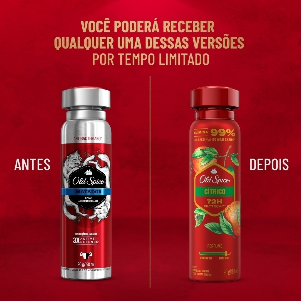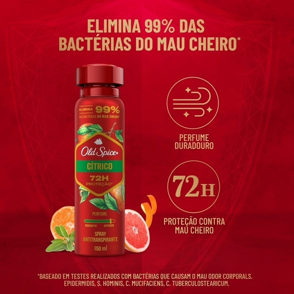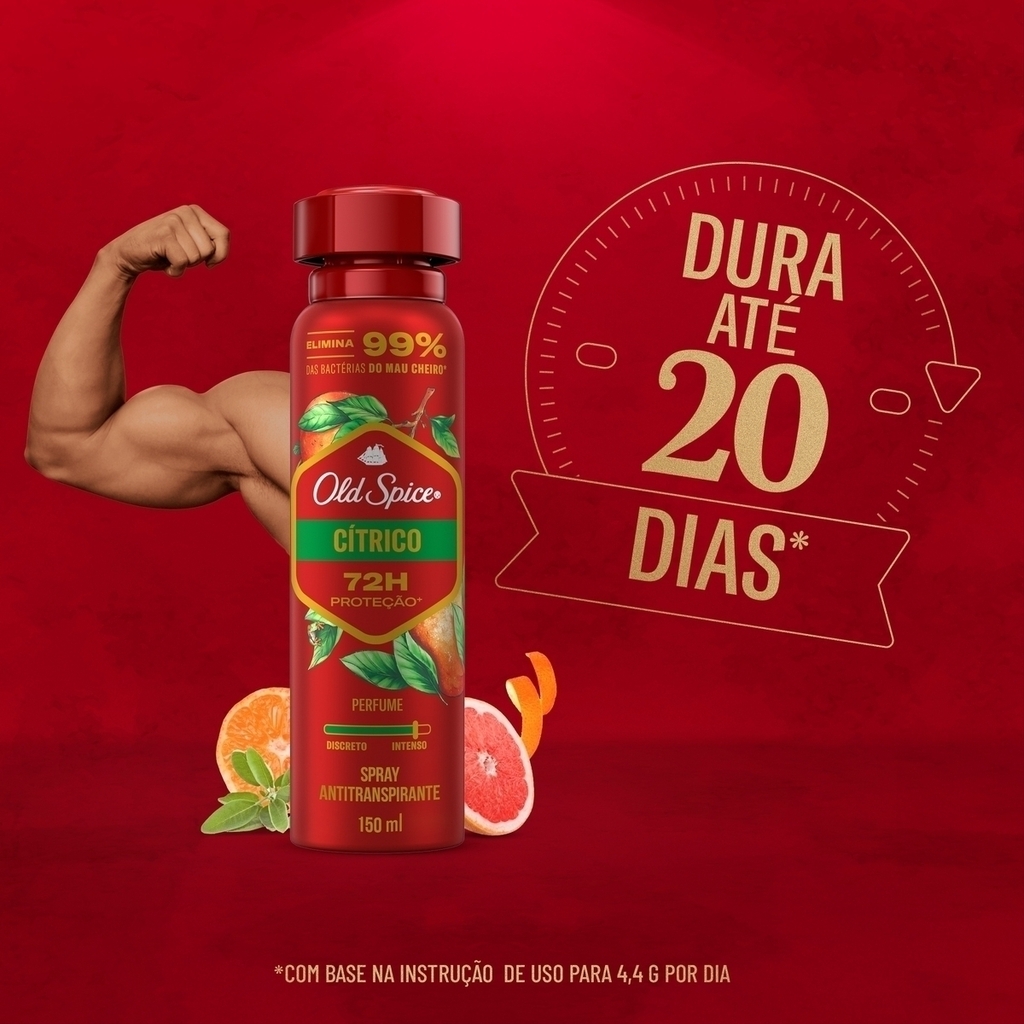 Arrase com o desodorante antitranspirante em spray Old Spice Cítrico! Proteção contra o suor e o mau cheiro e conforto que te acompanha o dia todo graças à fragrância refrescante com notas cítricas e frutadas.o Elimina 99% das bactérias do mau cheiro**Baseado em testes realizados com bactérias que causam o mau odor corporal: S. EPIDERMIDIS, S. HOMINIS, C. MUCIFACIENS, C. TUBERCULOSTEARICUMo 72 horas de proteção contra o mau cheiroo Sensação de frescor duradouroo Fragrância refrescante com notas cítricas e frutadaso Você longe do cheiro de cecê ou suoro Dura até 20 días****Com base na instruçao de uso para 4.4g por díao o