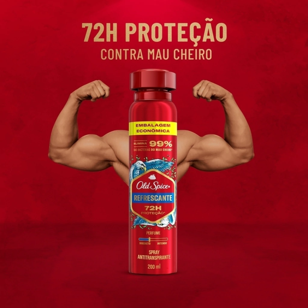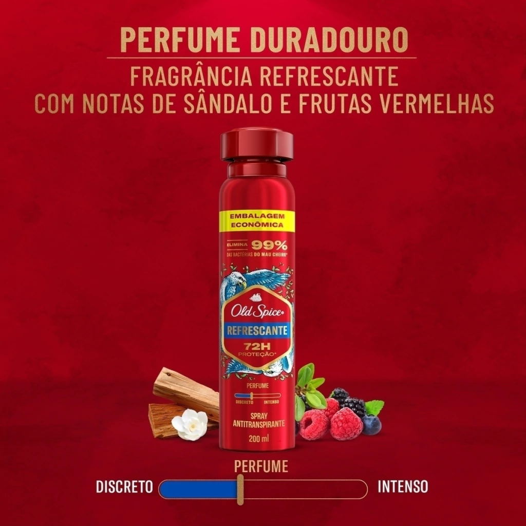 Experimente mais poder e estilo com o desodorante antitranspirante em spray Old Spice Refrescante! Sinta-se protegido contra o suor e o mau cheiro e enfrente seus desafios com mais confiança, graças à fragrância inesquecível que combina notas de sândalo e frutas vermelhas. E ainda, garanta o menor preço por ML de Old Spice.**Com base em preço por ML para a embalagem de 150 ml em comparação a embalagem de 200 ml.