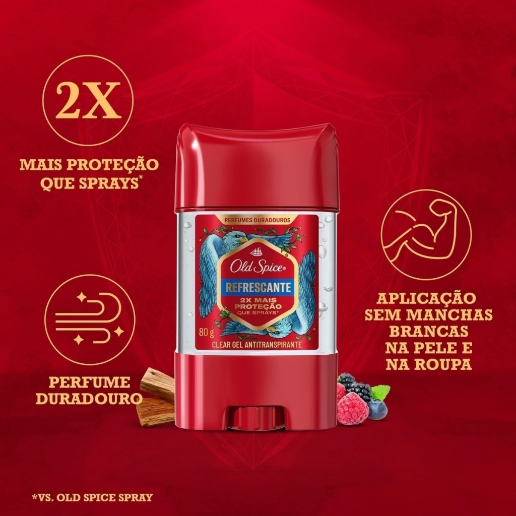 Experimente mais poder e estilo com o desodorante antitranspirante em gel Old Spice Refrescante! Sinta-se protegido contra o suor e o mau cheiro e enfrente seus desafios com mais confiança, graças a sua aplicação sem manchas brancas e aroma inesquecível que combina notas de sândalo e frutas vermelhas.
