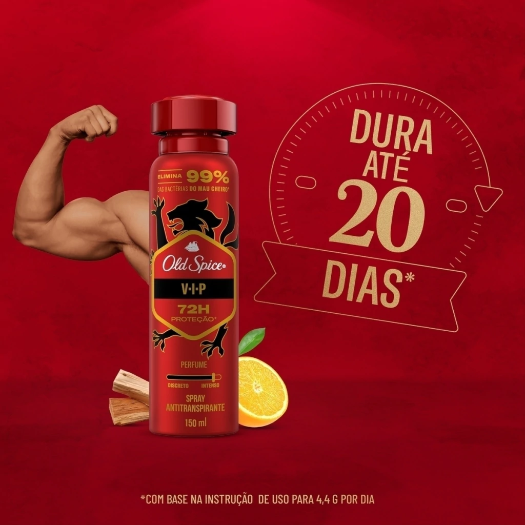 Experimente um toque de exclusividade com o desodorante antitranspirante em spray Old Spice VIP! Sinta-se revigorado e pronto para encarar o dia com confiança, graças à proteção contra o suor e o mau cheiro. Conte com uma fragrância frutada com notas verdes e especiarias.o Elimina 99% das bactérias do mau cheiro**Baseado em testes realizados com bactérias que causam o mau odor corporal: S. EPIDERMIDIS, S. HOMINIS, C. MUCIFACIENS, C. TUBERCULOSTEARICUMo 72 horas de proteção contra o mau cheiroo Sensação de frescor duradouroo Fragrância cítrica com notas amadeiradas e herbaiso Você longe do cheiro de cecê ou suoro Dura até 20 días****Com base na instruçao de uso para 4.4g por díao o |