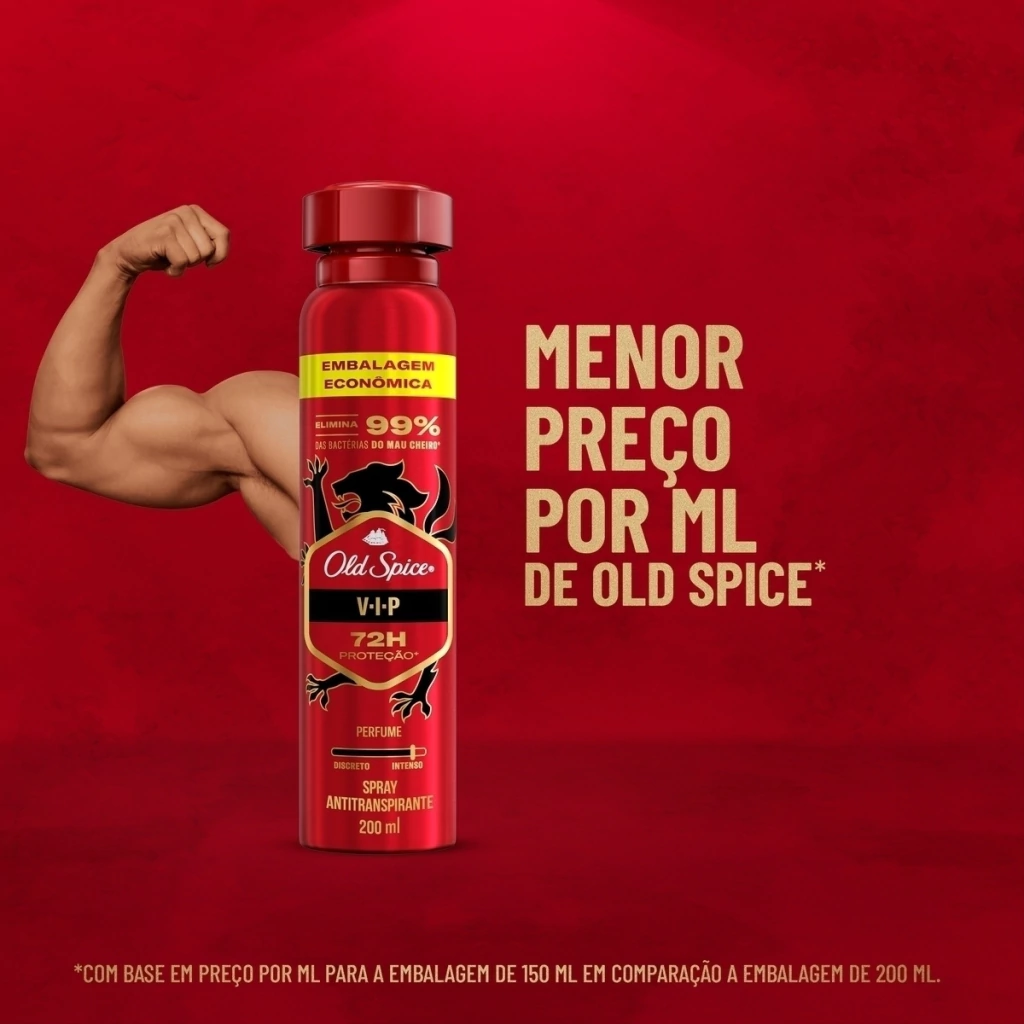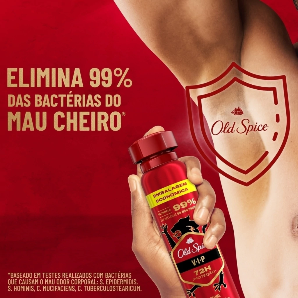 Experimente um toque de exclusividade com o desodorante antitranspirante em spray Old Spice VIP! Sinta-se revigorado e pronto para encarar o dia com confiança, graças à proteção contra o suor e o mau cheiro. Conte com uma fragrância frutada com notas verdes e especiarias. E ainda, garanta o menor preço por ML de Old Spice.**Com base em preço por ML para a embalagem de 150ml em comparação a embalagem de 200ml.o Elimina 99% das bactérias do mau cheiro****Baseado em testes realizados com bactérias que causam o mau odor corporal: S. EPIDERMIDIS, S. HOMINIS, C. MUCIFACIENS, C. TUBERCULOSTEARICUMo 72 horas de proteção contra o mau cheiroo Sensação de frescor duradouroo Fragrância cítrica com notas amadeiradas e herbaiso Você longe do cheiro de cecê ou suoro Dura até 27 días******Com base na instruçao de uso para 4.4g por díao o