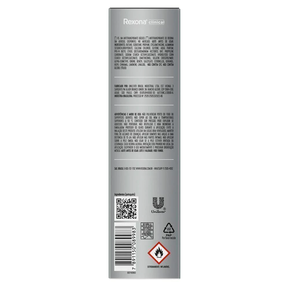o O Desodorante Antitranspirante Rexona Men Clinical Intense Fresh garante 96 horas de proteção contra suor e mau odor o Esse antitranspirante protege 3x mais contra a transpiração excessiva* e odor corporal que um antitranspirante comum o O Desodorante Clinical Rexona é um aerosol de alta performance com secagem rápida o A fórmula de Rexona Men Clinical garante máxima proteção e não deixa manchas nem marcas em suas roupas o Desodorante aerosol masculino com uma textura leve e um perfume extra fresco, fácil de aplicar, para que se sinta sempre seco e limpo o Rexona Men Clinical Intense Fresh está disponível no formato desodorante aerosol