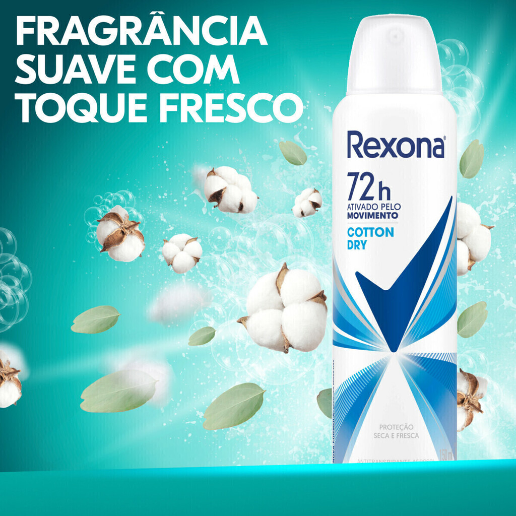Mais uma vez Rexona se supera e relança sua linha de desodorantes com uma fórmula inovadora, o Desodorante Aerosol Feminino Rexona Cotton Dry combina um novo e exclusivo ativo antitranspirante com a tecnologia de fragrâncias encapsuladas. Esse desodorante antitranspirante aerosol a mantém protegida por até 72 horas, ativado pelo seu movimento e a deixa muito mais confiante para você encarar qualquer desafio. Com o registro de 16 patentes e mais de 300 testes técnicos, está comprovado que essa nova tecnologia antitranspirante entrega um nível de proteção contra o suor como nenhuma outra proposta regular já entregou antes. A nova e exclusiva fórmula de Rexona Cotton Dry trabalha com um sistema de partículas menores e mais estáveis que formam uma barreira protetora mais resistente e duradoura contra a transpiração e o mau odor, mantendo você seca, refrescada e protegida a cada novo movimento e por muito mais tempo. Sua fragrância contém uma rica combinação de notas verdes e florais, garantindo a sensação de frescor durante o dia inteiro.