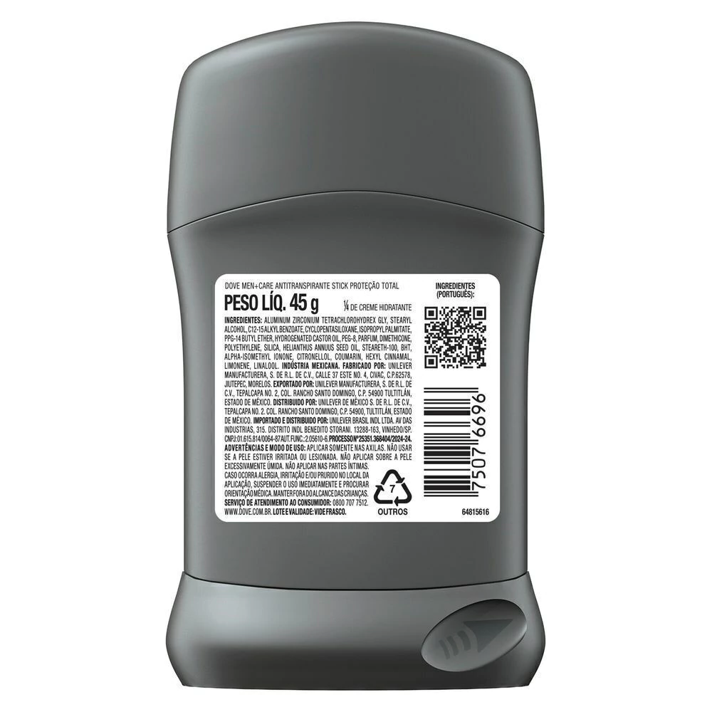 o O Desodorante Antitranspirante Stick Dove Men+Care Proteção Total com 1/4 de creme hidratante e vitamina E, cuida, protege e repara a pele das axilas o Este desodorante masculino protege contra o suor e mau odor por 72 horas, sem irritar a pele o A fórmula deste desodorante é sem álcool e gentil com a pele, deixando-a suave e hidratada o É um desodorante stick de fácil aplicação, que possui um aplicador de contato com toque seco, garantindo uma proteção antitranspirante eficaz durante todo o dia o O antitranspirante stick Dove Men+Care Proteção Total possui uma fragrância confortável para uma sensação de limpeza e frescor o Este desodorante é certificado como Cruelty-Free pela PETA, o que garante que Dove não realiza nem realizará testes em animais