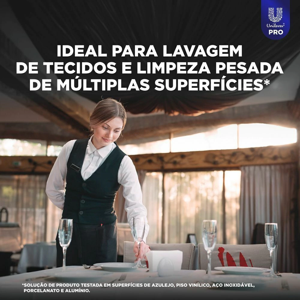 *Solução de produto testada em superfícies de azulejo, piso vinílico, aço inoxidável, porcelanato e alumínio. **Rendimento calculado de acordo com a recomendação de uso para sujeira moderada. Máquina de capacidade 11 kg. ***Rendimento calculado de acordo com a recomendação de uso para limpeza diária. ****Pisos que possam ser lavados.