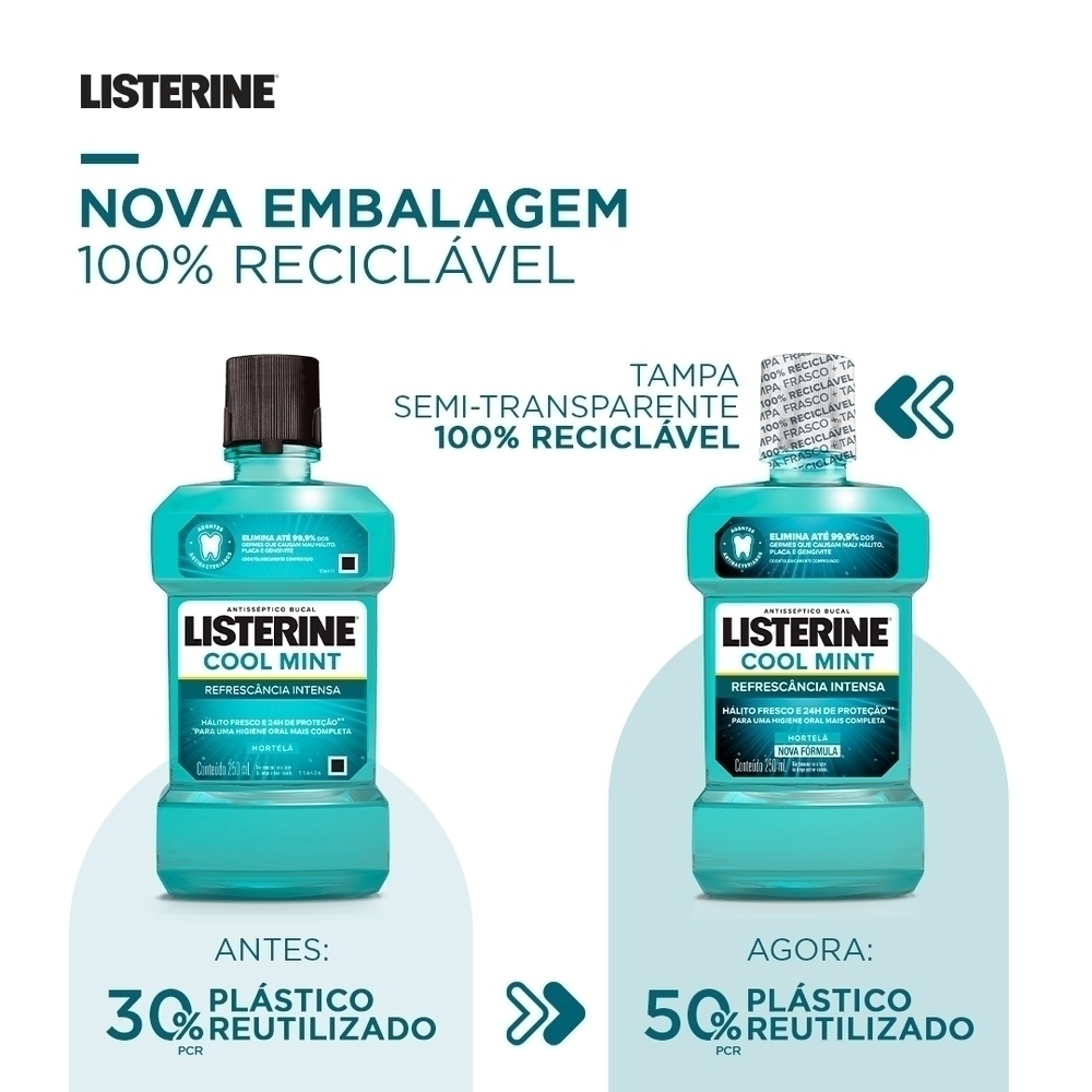 O Listerine Cool Mint é um antisséptico bucal que mata até 99% dos germes e bactérias que causam placa, gengivite e mau hálito; seu sabor de menta proporciona hálito fresco. Alcançando onde o fio e a escova não chegam. Desenvolvido para manter o hálito fresco, quanto utilizado duas vezes ao dia, pela manhã e pela noite após a escovação e fio dental, promove uma sensação de referencia. Mata os germes que causam mau hálito, placa bacteriana e gengivite; oferece até 12 horas de proteção contra os germes