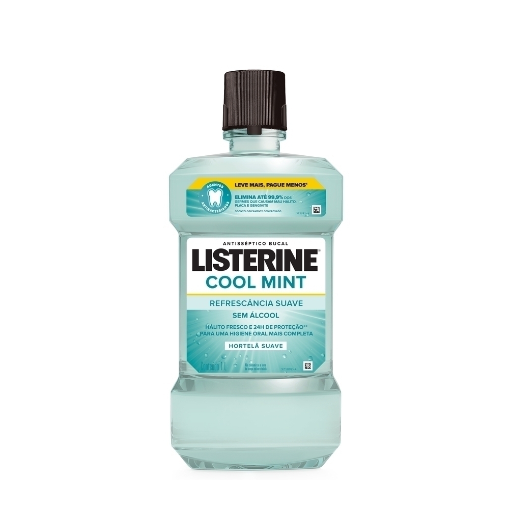 Você sabia que os dentes são apenas 25% da sua boca? Por isso, apenas a escovação não garante uma limpeza completa. Adicione LISTERINE® Cool Mint Enxaguante Bucal Sem Álcool, 1L à sua rotina e limpe aonde a escova não alcança, eliminando até 99% dos germes* causadores de mau hálito, placa bacteriana e gengivite. Inclua LISTERINE® e limpe até 100% da sua boca.