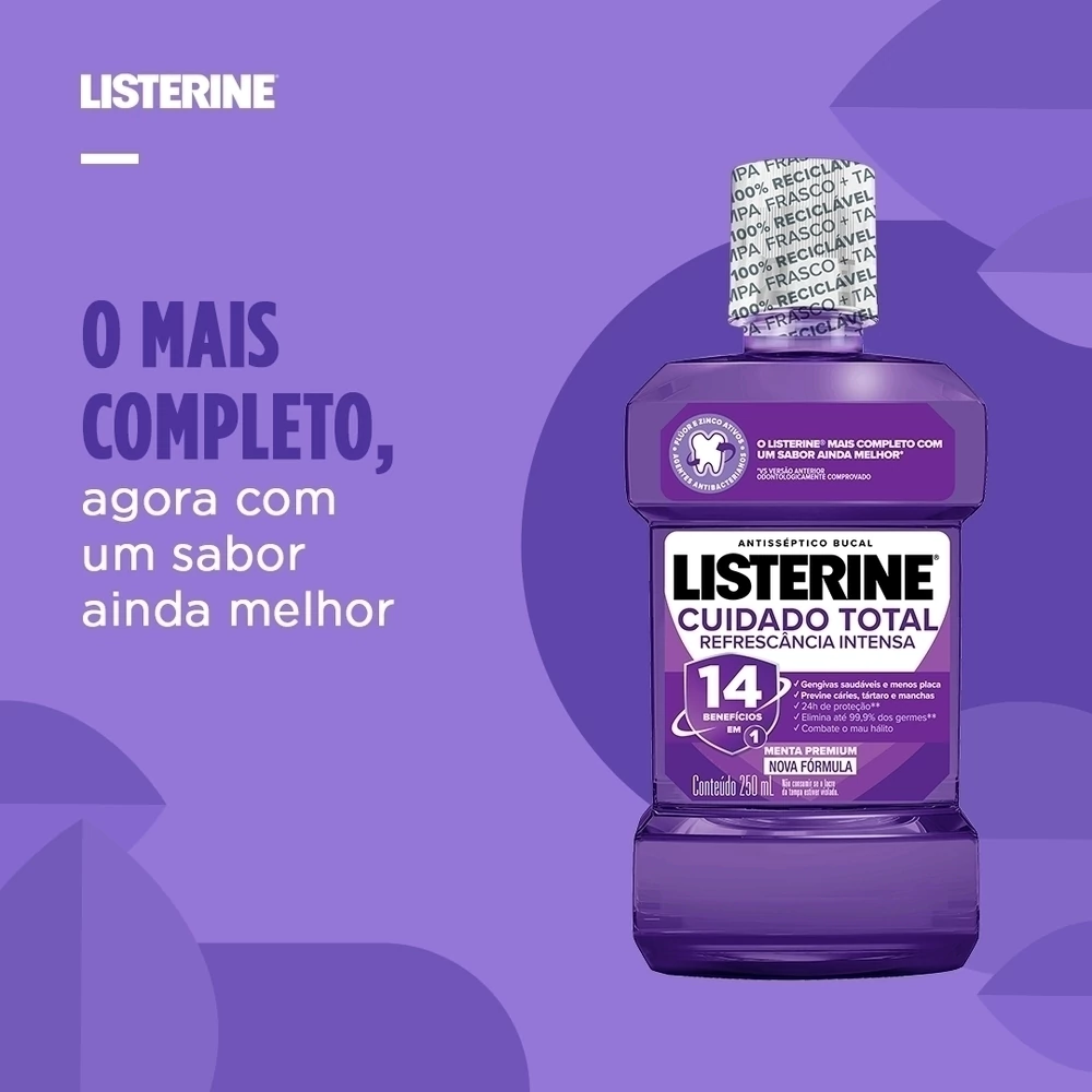 Você sabia que os dentes são apenas 25% da sua boca? Por isso, apenas a escovação não garante uma limpeza completa. Adicione LISTERINE® Cuidado Total 14 Benefícios em 1 Enxaguante Bucal, 250mL à sua rotina e limpe aonde a escova não alcança, eliminando até 99, 9% dos germes* causadores de mau hálito, placa bacteriana e gengivite,e também prevenindo contra cárie e tártaro. Proporcionando dentes e boca mais saudáveis! Inclua LISTERINE® e limpe até 100% da sua boca.