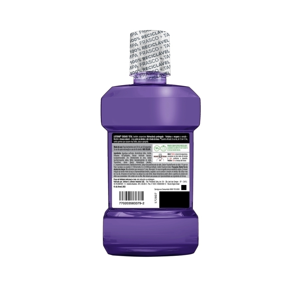 Produto 100% reciclável (frasco e tampa) e feito com 30% de plástico recicladoEspecialista em enxaguante bucal há mais de 140 anos