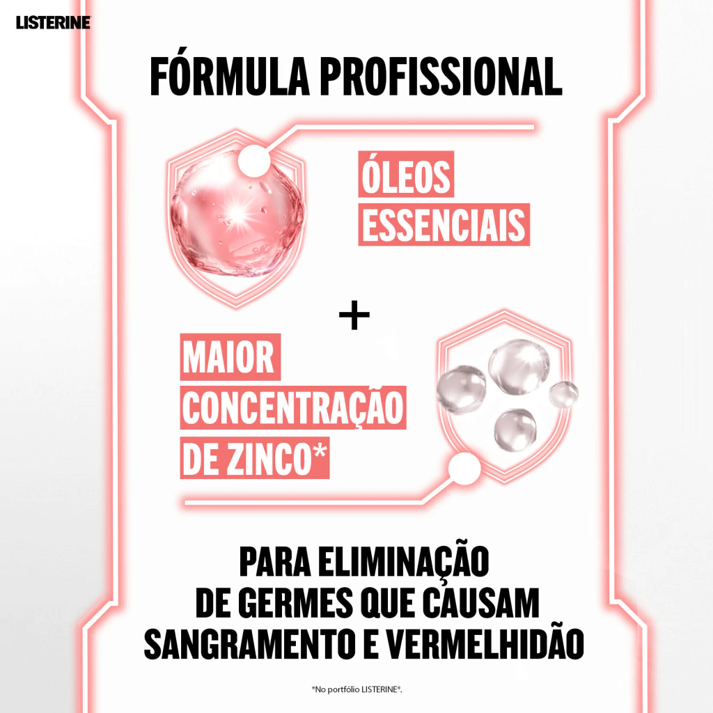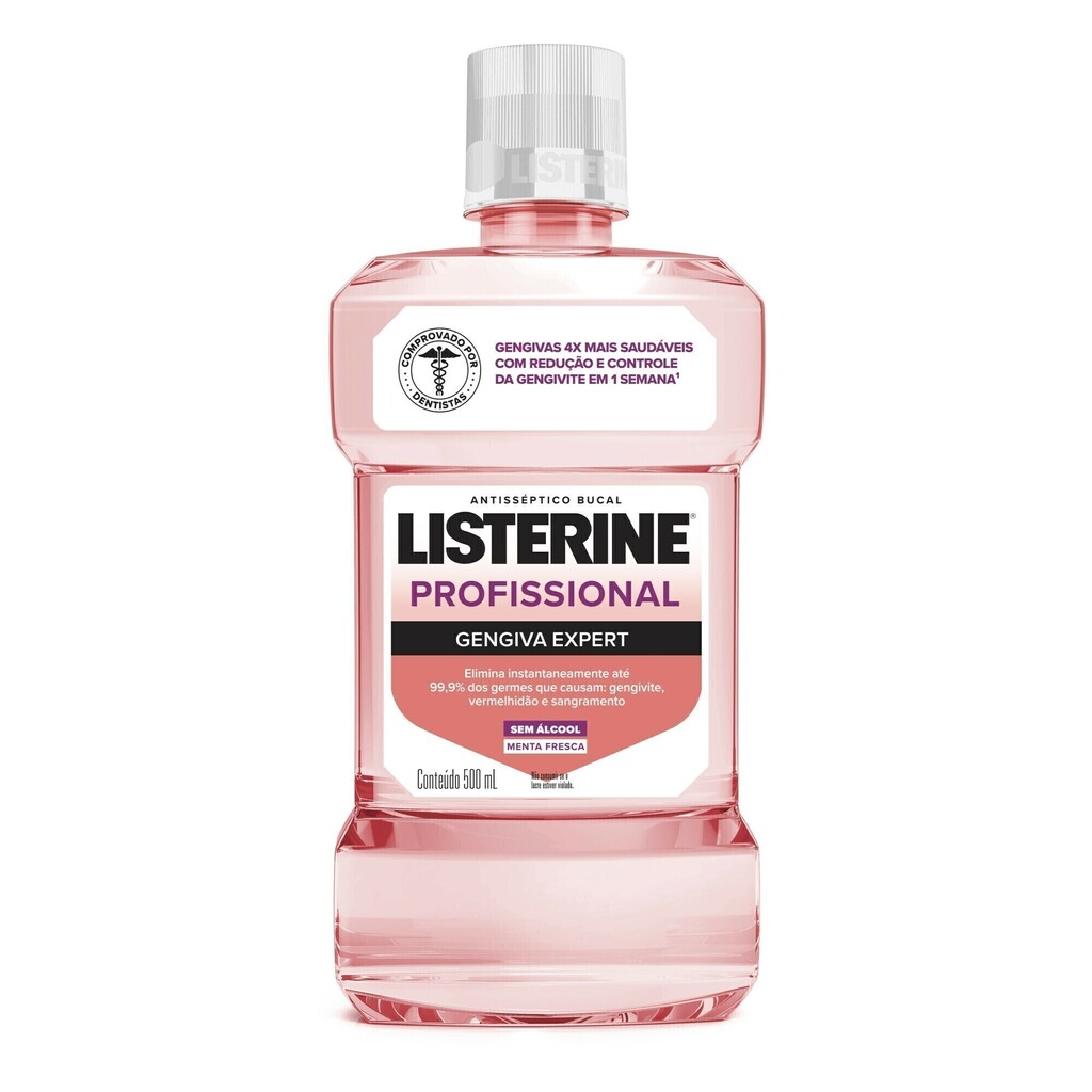 Você sabia que os dentes são apenas 25% da sua boca? Por isso, apenas a escovação e o fio dental não garantem uma limpeza completa. Adicione LISTERINE® Profissional Gengiva Expert é a fórmula de cuidado bucal mais avançada de LISTERINE®. Com máxima concentração de Zinco, elimina até 99,9% dos germes que causam a gengivite bacteriana e seus sintomas. Na primeira semana de uso, reduz sangramentos em 58%, proporcionando alívio. Sua fórmula exclusiva com 4 óleos essenciais é segura e pode ser utilizada diariamente.