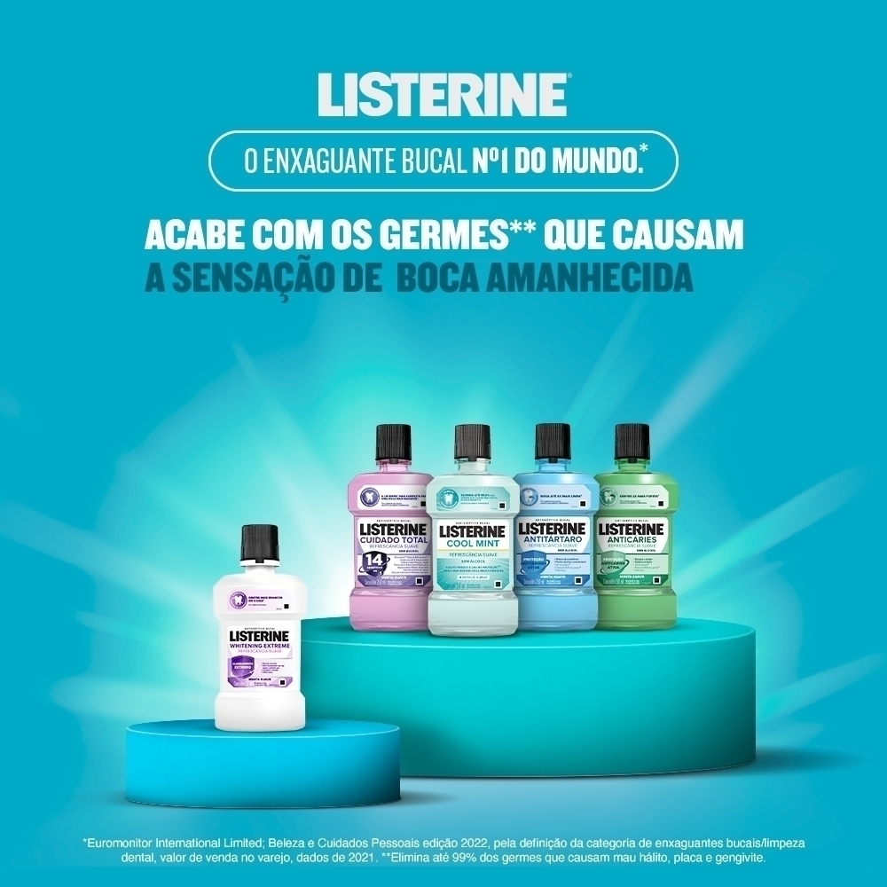Você sabia que os dentes são apenas 25% da sua boca? Por isso, apenas a escovação não garante uma limpeza completa. Adicione LISTERINE® Whitening Extreme Enxaguante Bucal, 236mL à sua rotina e limpe aonde a escova não alcança, eliminando até 99, 9% dos germes* causadores de mau hálito, placa bacteriana e gengivite. Com ação branqueadora, ele mata os germes que causam o mau hálito e clareia os dentes. Inclua LISTERINE® e limpe até 100% da sua boca.