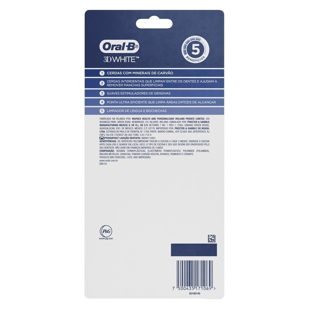 A escova dental Oral-B 5x Ações com Carvão foi especialmente desenvolvida para proporcionar uma melhor experiência de escovação. Graças a sua tecnologia de cerdas polidoras com minerais de carvão que te ajudam na remoção das manchas superficiais dos seus dentes. Além disso, ela conta com cerdas interdentais que limpam entre seus dentes para te proporcionar uma sensação de limpeza 100%. Possui massageadores de borracha que estimulam suas gengivas, com uma ponta ultra efetiva para limpeza em áreas de difícil alcance.