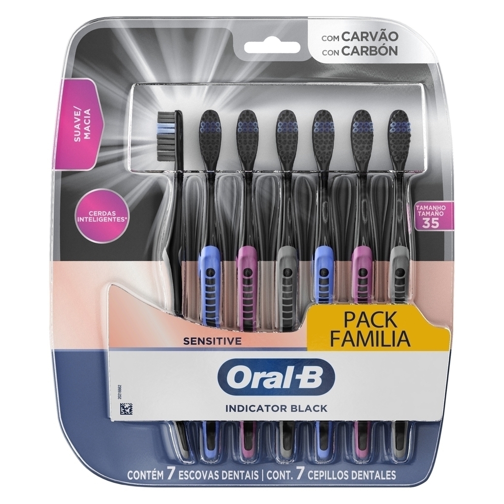 O que é a escova de dente Oral B Indicator Black? Oral B Indicator Black é uma escova dental manual de uso diário. Este modelo está disponível em embalagem com 7 unidades. Para que serve a escova de dente Oral B Indicator Black? Indicada para purificar suavemente os dentes, a escova de dente Oral B Indicator Black Sensitive é feita com cerdas de carvão ativado extra macias com ponta arredondada que cuidam da sua gengiva, além de ajudar a remover mesmo as partículas mais difíceis que acabam ficando entre os dentes e a gengiva. Benefícios e diferenciais da escova de dente Oral B Indicator Black Purifica suavemente os dentes. Remove as partículas mais difíceis entre os dentes e a gengiva. Com cerdas de carvão ativado extra macias com ponta arredondada que cuidam da sua gengiva. Embalagem com 7 unidades. Como usar a escova de dente Oral B Indicator Black? Escove os dentes diariamente depois de cada refeição, pelo menos 3 vezes ao dia ou segundo orientação do seu dentista. Especificações Marca: Oral B. Modelo: Indicator Black. Fabricante: P&G. Quantidade: 7 unidades. Advertências Use fio dental. Troque sua escova de dentes a cada 3 meses. Consulte seu dentista regularmente. Se houver irritação, suspenda o uso imediatamente e procure orientação médica. Mantenha fora do alcance das crianças.