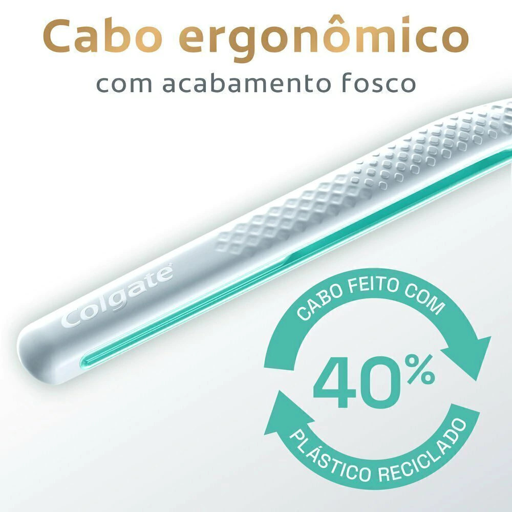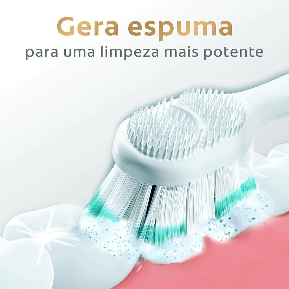 Como funciona? Essa configuração única de cerdas gera espuma rapidamente, levando a pasta de dente a lugares onde as bactérias mais se escondem, como os espaços estreitos entre os dentes e sobre a linha da gengiva. Além disso, seu limpador de língua e bochechas remove as bactérias causadoras do mau hálito.