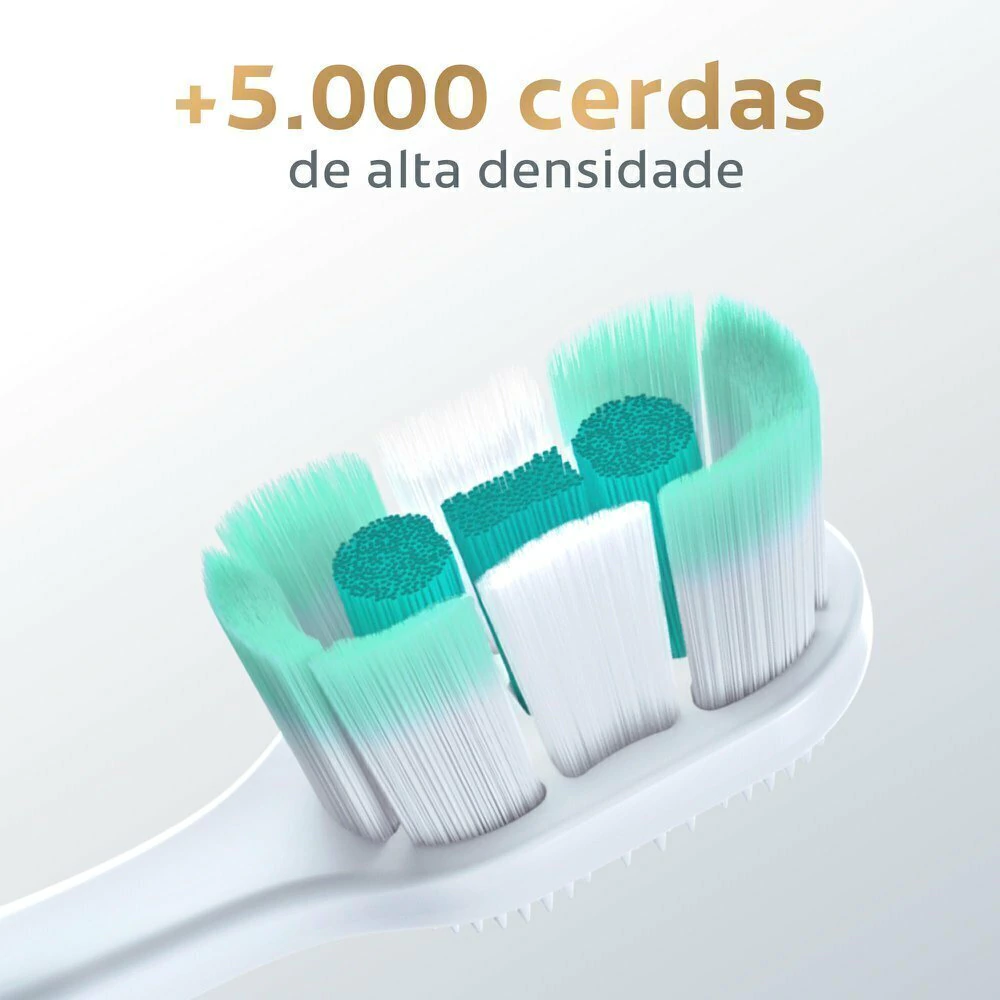 Projetada por especialistas, combina: (1) Tecnologia de alta densidade com mais de 5.500 cerdas macia, (2) Dois tipos de cerdas: com ponta fina para uma limpeza dental profunda e ponta arredondada para limpar delicadamente a superfície do dente, (3) Corte multinível que se ajusta ao contorno do dente.