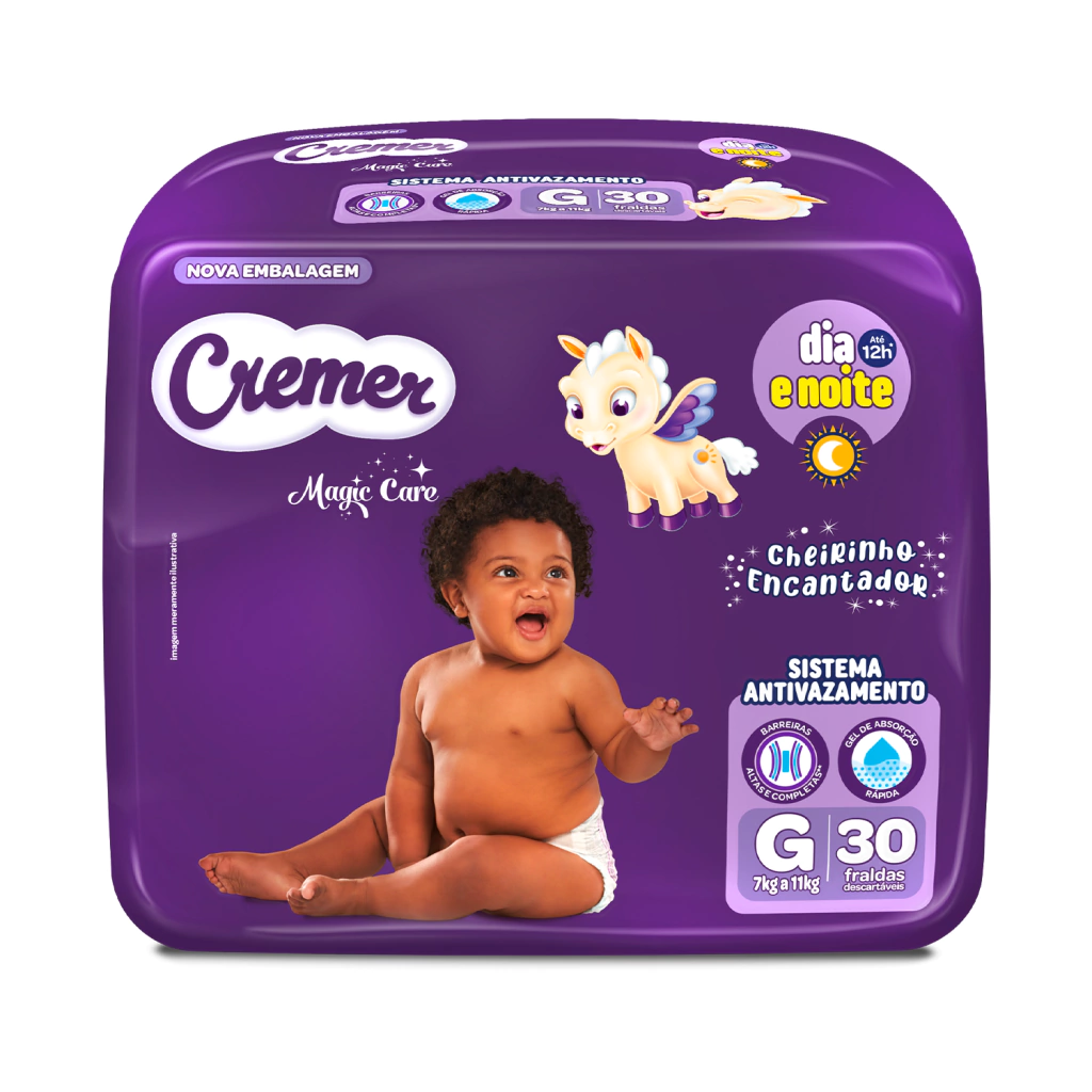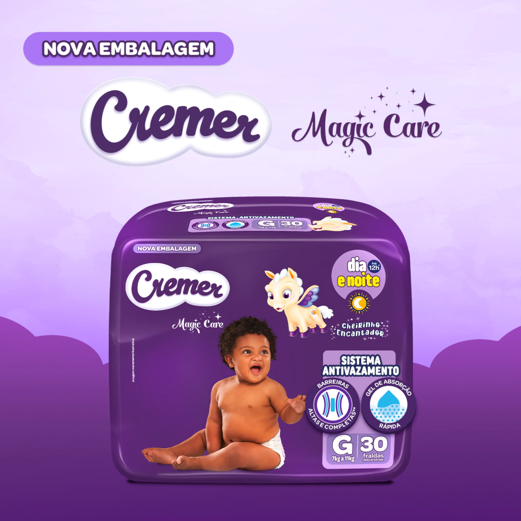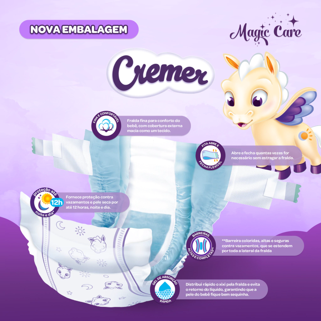 A nova fralda Cremer agora está mais fina e mais confortável, com proteção até 12h contra vazamentos! Além disso a fralda conta com um novo sistema antivazamento, composto por uma nova fita abre e fecha mais flexível e orelhas maiores que se ajustam ao corpinho do bebê, e uma camada super absorvente que distribui rápido o xixi pela fralda e evitando o retorno do líquido e garantindo que a pele do bebê fique bem sequinha. A nova Cremer traz proteção para noites tranquilas e dias mágicos, ainda mais confortáveis.