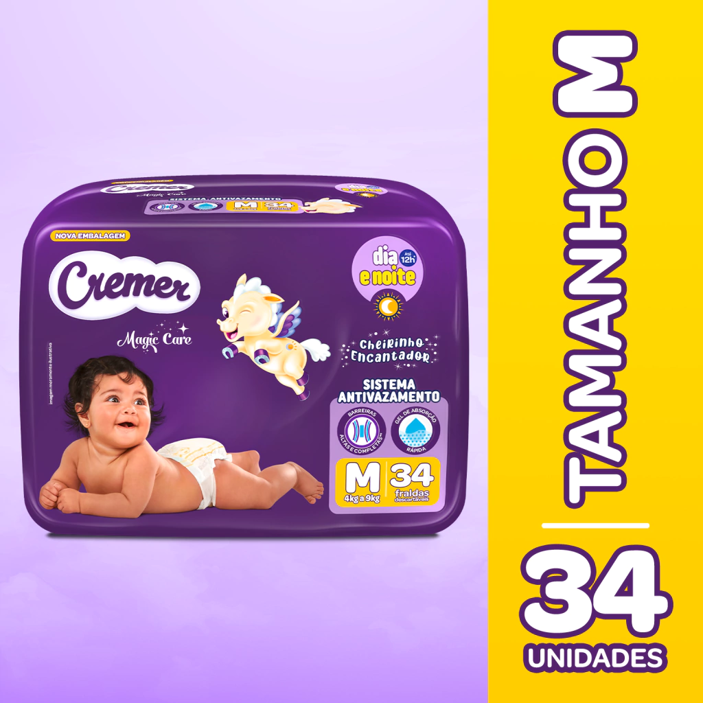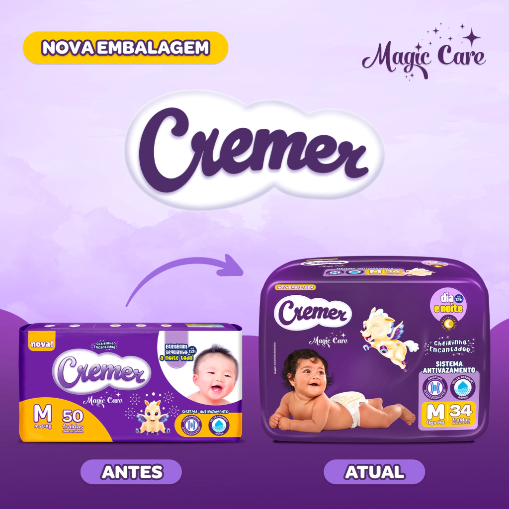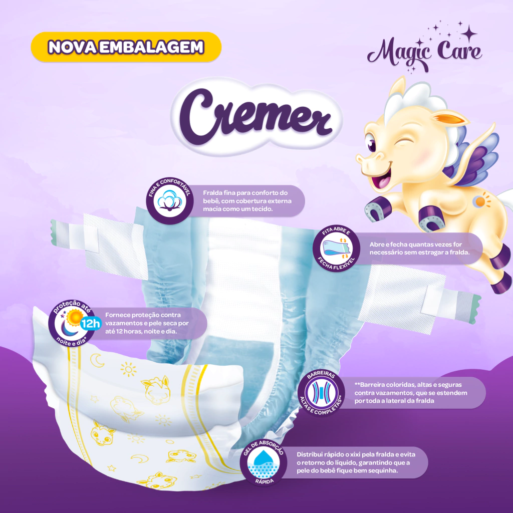 A nova fralda Cremer agora está mais fina e mais confortável, com proteção até 12h contra vazamentos! Além disso a fralda conta com um novo sistema antivazamento, composto por uma nova fita abre e fecha mais flexível e orelhas maiores que se ajustam ao corpinho do bebê, e uma camada super absorvente que distribui rápido o xixi pela fralda e evitando o retorno do líquido e garantindo que a pele do bebê fique bem sequinha. A nova Cremer traz proteção para noites tranquilas e dias mágicos, ainda mais confortáveis.
