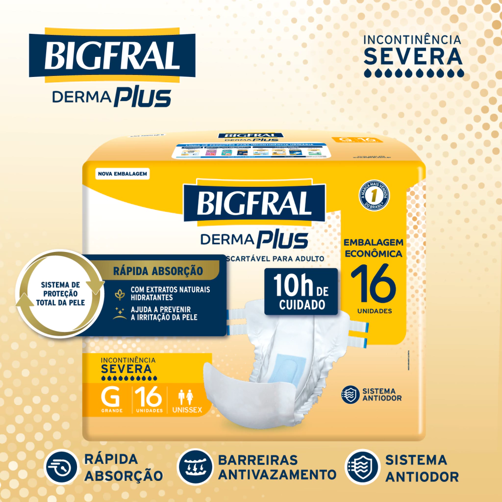 A Bigfral DermaPlus foi desenvolvida para adultos com incontinência urinária severa. Possui o exclusivo sistema de proteção total da pele, com extratos naturais hidratantes que ajudam a prevenir irritações, mantendo a pele protegida e saudável, além de sistema antiodor, trazendo até 10h de proteção e cuidado.