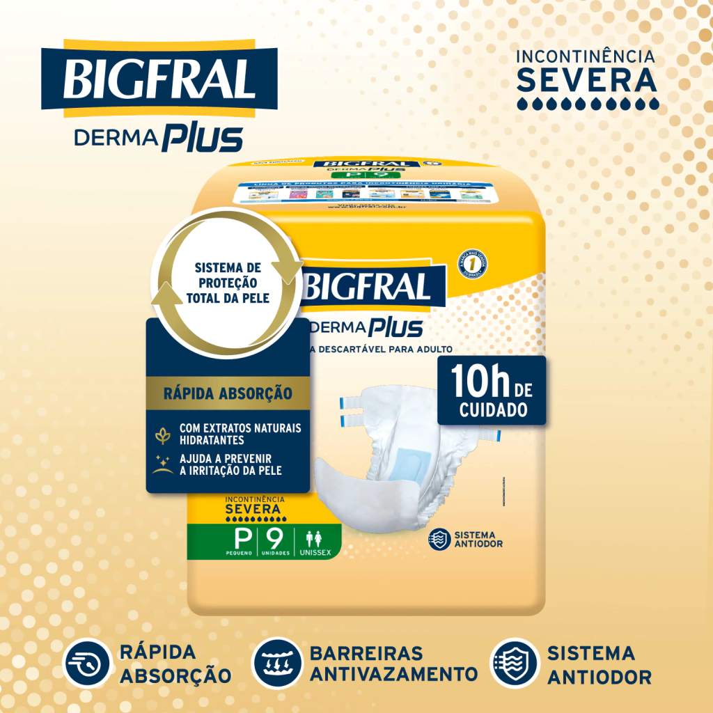 A Bigfral DermaPlus foi desenvolvida para adultos com incontinência urinária severa. Possui o exclusivo sistema de proteção total da pele, com extratos naturais hidratantes que ajudam a prevenir irritações, mantendo a pele protegida e saudável, além de sistema antiodor, trazendo até 10h de proteção e cuidado.