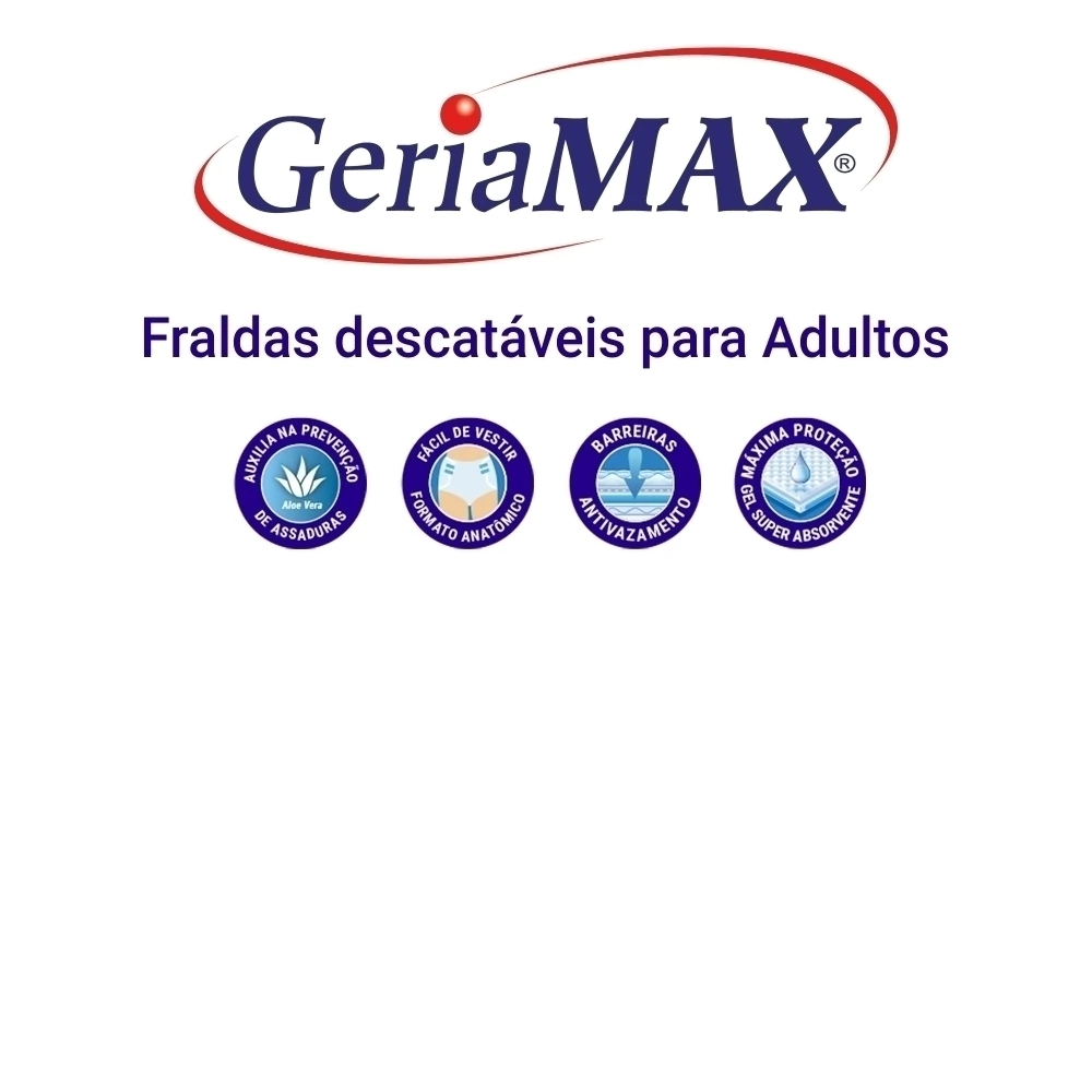 As Fraldas Geriamax foram pensadas em proporcionar mais conforto e proteção, com formato anatômico, cobertura suave, barreiras laterais anti-vazamentos e elásticos auto ajustáveis nas pernas.O Gel Protector® absorve o liquido transformando em cristais, garante maior absorção e indicador de umidade, que identifica o melhor momento para troca.