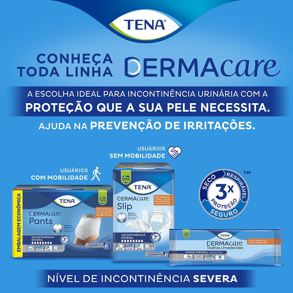 Fralda TENA Dermacare possui dupla camada e um núcleo de alta absorção que rapidamente retém a urina promovendo segurança em um produto hipoalergênico. Com tecido macio e respirável que permite a respiração da pele, mantém a mesma sempre seca e saudável, ajudando a prevenir irritações. Possui tecnologia antivazamento com barreiras protetoras, elásticos nas costas e controle antiodor. Indicada para incontinência urinária e fecal em usuários com pouca ou nenhuma mobilidade.