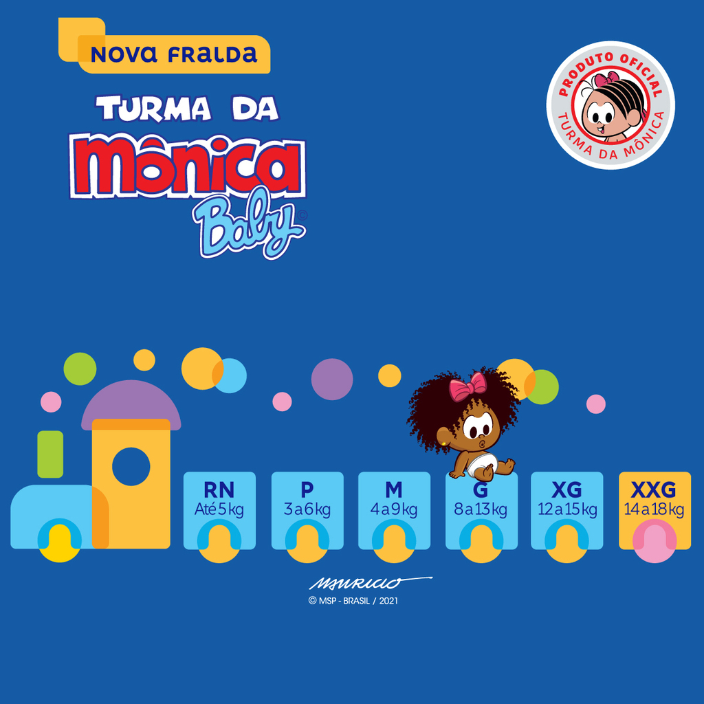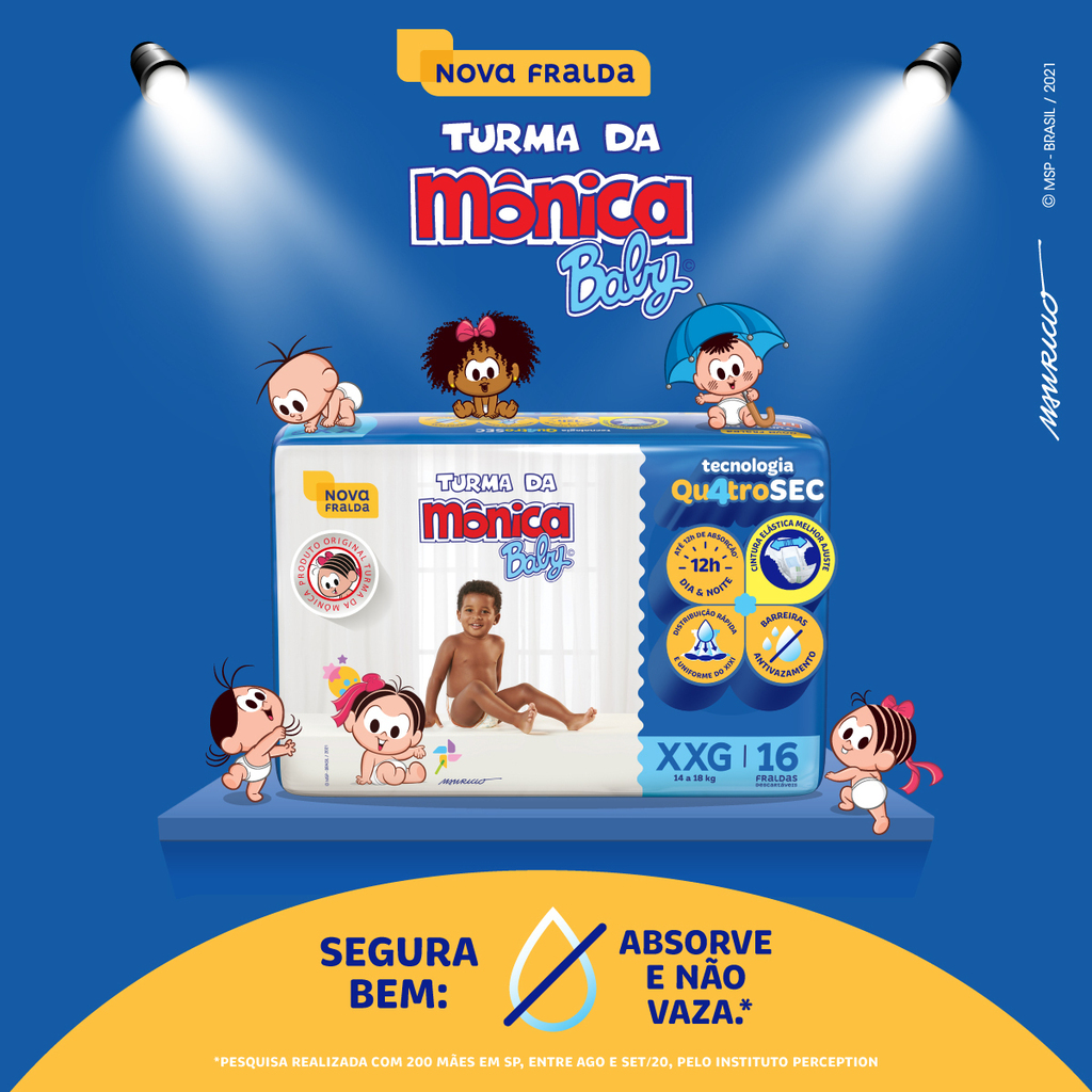 A Turma da Mônica Baby uniu proteção e conforto em uma nova opção de fralda, para garantir que seu bebê cresça feliz e tenha as melhores lembranças da sua infância. A Nova fralda Turma da Mônica Baby possui a nova Tecnologia QuatroSec para que ele fique calmo, tranquilo e seguro durante o dia e a noite toda. Conta com um exclusivo sistema de canais que distribui mais rápido o xixi, barreiras anti-vazamento e uma fina camada extra que ajuda a manter o bebê sequinho por até 12 horas, além de cintura elástica que proporciona um perfeito ajuste no corpinho.