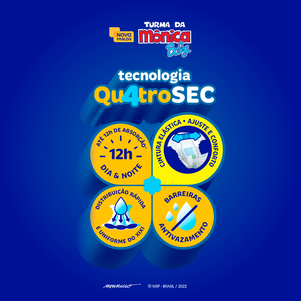 A Turma da Mônica Baby uniu proteção e conforto em uma nova opção de fralda, para garantir que seu bebê cresça feliz e tenha as melhores lembranças da sua infância. A Nova fralda Turma da Mônica Baby possui a nova Tecnologia QuatroSec para que ele fique calmo, tranquilo e seguro durante o dia e a noite toda. Conta com um exclusivo sistema de canais que distribui mais rápido o xixi, barreiras anti-vazamento e uma fina camada extra que ajuda a manter o bebê sequinho por até 12 horas, além de cintura elástica que proporciona um perfeito ajuste no corpinho.