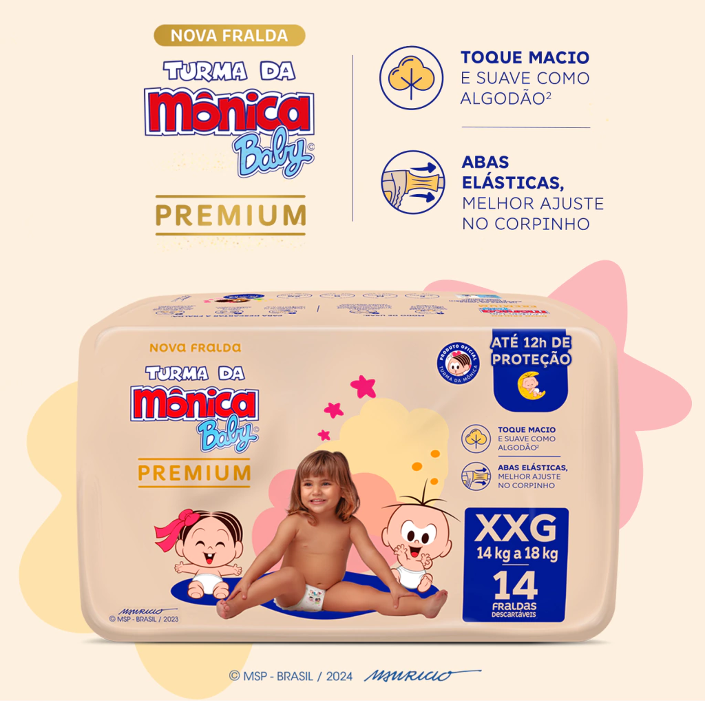 A nova fralda Turma da Mônica Baby Premium chegou, com até 12 horas de proteção e um toque macio e suave como algodão, garantindo conforto para o seu bebê. Suas abas elásticas proporcionam um melhor ajuste no corpinho, além de ter barreiras antivazamento que oferecem proteção durante o dia e a noite.Uma escolha segura e confortável para um carrinho especial a cada troca.