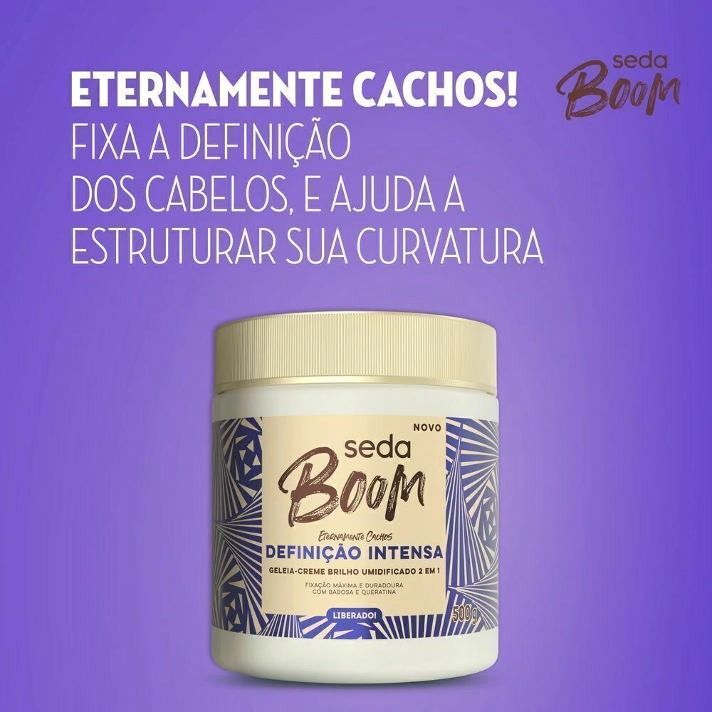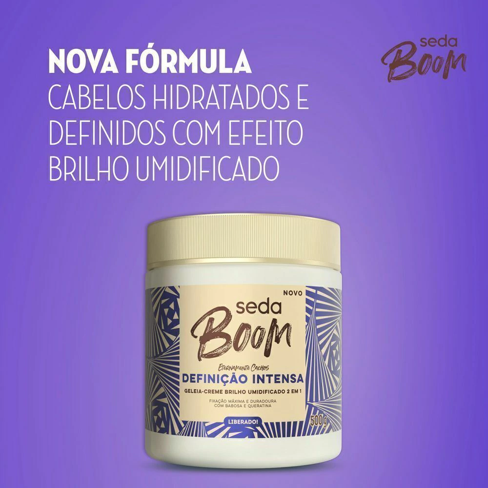oA Geleia - Creme Seda Boom Definição Intensa é o novo produto de finalização que fixa a definição dos cachos e ajuda a estruturar sua curvatura por mais tempo oA fórmula dessa geleia é enriquecida com babosa, que promove maciez e brilho aos fios, e queratina, que sela e dá resistência ao cabelo oEssa geleia - creme possui alta fixação com ação 2 em 1: hidrata como um creme de pentear e fixa a definição como uma geleia, criando um efeito de brilho umidificado oEste finalizador de cabelo Seda Boom dispensa o uso combinado com outros cremes para pentear, e deve ser usado individualmente para ativar a definição oEssa geleia capilar é ideal para cabelos cacheados e ondulados e é liberada, livre de petrolatos, parabenos, silicone e óleo mineral oA Geleia - Creme Seda Boom Definição Intensa deixa seu cabelo cacheado profundamente macio