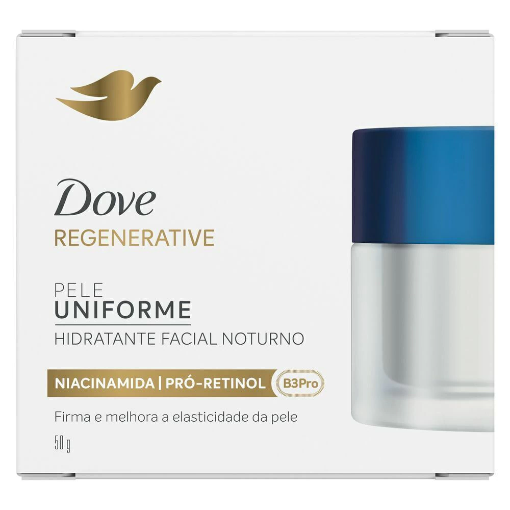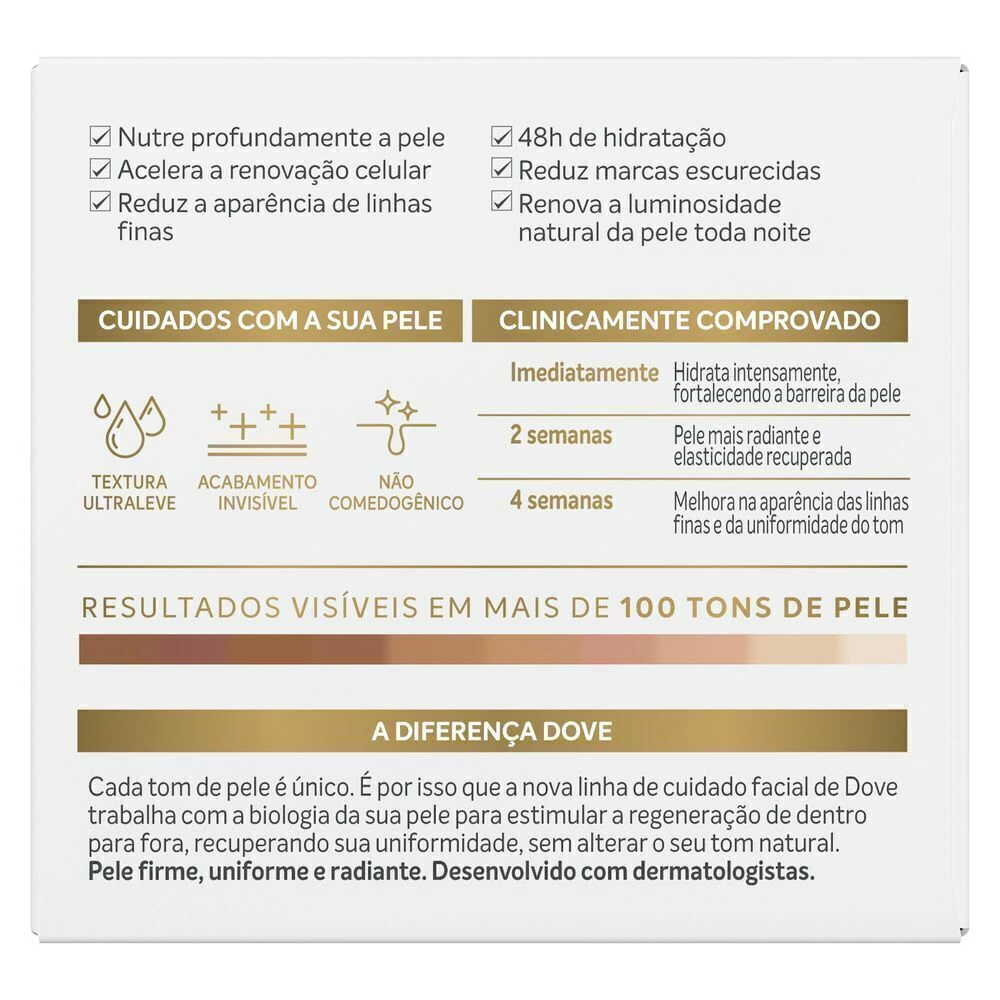 Cada tom de pele é único e é por isso que a nova linha de cuidado facial de Dove trabalha com a biologia da sua pele para estimular a regeneração de dentro para fora, recuperando sua uniformidade, sem alterar o seu tom natural, pois possui a Tecnologia B3Pro que aumenta a produção de 9 tipos de colágeno, reforçando a barreira da pele em até 3x, dá firmeza à pele e melhora sua elasticidade. Pele firme, uniforme e radiante. O hidratante facial Dove Niacinamida e Pró-Retinol, foi desenvolvido com dermatologistas. Sua fórmula é não comedogênica, possui uma textura ultraleve e um acabamento invisível. O Hidratante Facial Noturno Dove Niacinamida e Pró-retinol nutre profundamente a pele, ajuda a manter a hidratação, e acelera a renovação celular noturna, deixando sua pele uniforme e radiante. Está clinicamente comprovado que hidrata intensamente desde o primeiro uso, fortalecendo a barreira da pele, que em 2 semanas a pele fica mais radiante e a elasticidade é recuperada, e após 4 semanas de utilização, melhora a aparência das linhas finas e dá uniformidade ao tom. Modo de uso: Aplique no rosto, pescoço e colo limpos antes de dormir e espalhe até sentir a absorção completa. Este produto foi testado em mulheres reais, 8 em cada 10 mulheres sentem uniformização do tom da pele. Resultados visíveis em mais de 100 tons de pele.