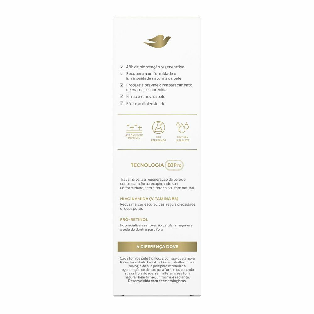 o O novo Dove Tratamento Facial Regenerativo 3 em 1 promove 48h de hidratação, uniformização da pele sem alterar o tom e FPS30 contra danos do sol o A Niacinamida ativa somada ao FPS30 potencializa a ação protetora da fórmula, mantendo a pele protegida das principais causas de marcas escurecidas o Está clinicamente comprovado que hidrata e protege, revelando a luminosidade saudável da pele. Com seu uso prolongado, melhora a uniformidade de tom e textura da pele o O Tratamento 3 em 1 possui uma Tecnologia B3Pro com Niacinamida e Pró-retinol, dois ingredientes que estimulam a regeneração de dentro para fora, para uma pele firme, uniforme e radiante o A fórmula deste hidratante facial é não comedogênica, sem parabenos e possui uma textura não oleosa de rápida absorção. Desenvolvida com dermatologistas o O uso regular deste tratamento facial ajuda na redução de marcas escurecidas do rosto a partir de 4 semanas. Descubra a diferença de Dove com o Tratamento Facial Regenerativo 3 em 1. Cada tom de pele é único e é por isso que a nova linha de cuidado facial de Dove trabalha com a biologia da sua pele para estimular a regeneração de dentro para fora, recuperando sua uniformidade, sem alterar o seu tom natural, pois possui a Tecnologia B3Pro com Niacinamida e Pró-retinol, dois ingredientes que estimulam a regeneração de dentro para fora, para uma pele firme, uniforme e radiante. O Tratamento Facial Regenerativo 3 em 1 Dove, hidratante + sérum uniformizador + FS30 foi desenvolvido com dermatologistas. A fórmula deste hidratante facial é não comedogênica, sem parabenos e possui uma textura não oleosa de rápida absorção. O Tratamento Facial Regenerativo 3 em 1, garante 48h de hidratação, uniformiza a pele sem alterar o tom e protege contra danos do sol com FPS30. Está clinicamente comprovado que hidrata intensamente desde o primeiro uso, garantindo um sensorial aveludado, e após 4 semanas de utilização, deixa o tom de pele mais uniforme e as marcas escurecidas reduzidas. Modo de uso: Aplique de duas a três doses no rosto limpo e espalhe até a absorção completa. Deve ser usado no rosto pela manhã após a limpeza e antes do uso da maquiagem. Para melhores resultados, reaplique mais uma vez ao longo do dia. Uso externo. Este produto foi testado em mulheres reais, 9 em cada 10 mulheres sentiram a pele mais uniforme*. Resultados visíveis em mais de 100 tons de pele. *Teste de Percepção em 31 mulheres por 4 semanas com o Dove Regenerative 3 em 1.