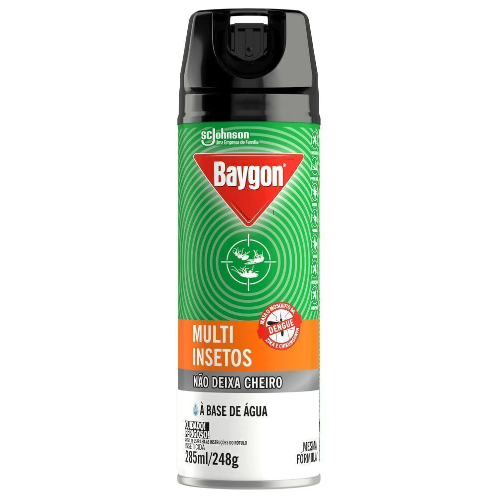 "Baygon Multi Insetos possui fórmula à base de água. É altamente eficaz contra insetos voadores como mosquitos, pernilongos, carapanãs, muriçocas e moscas e até contra o mosquito que pode transmitir a Dengue, o Zika Vírus e a Chikungunya. Mata também baratas e formigas.