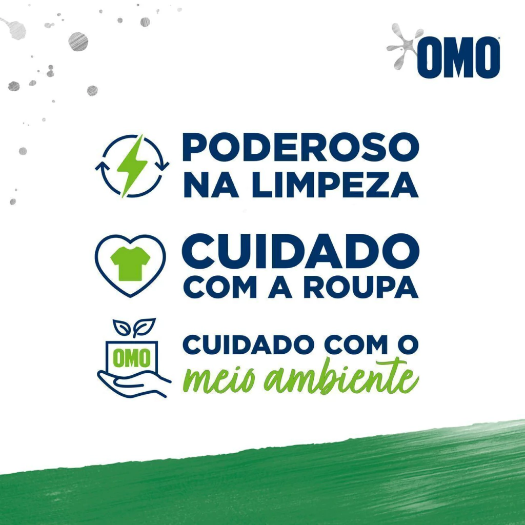 Para saber mais sobre a linha de produtos OMO, OMO Tira Manchas e OMO Desinfetantes, acesse o site. Mantenha o produto fora do alcance de crianças e dos animais domésticos. Leia o rótulo antes de usar o produto. ¹Eficácia comprovada contra o vírus SARS-CoV-2 na dosagem para ação sanitizante e contra as bactérias testadas: Staphylococcus aureus, Salmonella choleraesuis. ²Comparado com detergentes em pó do mesmo fabricante. Remove manchas como suco de laranja, sobremesa de chocolate e óleo de fritura, tecido algodão. ³Reduzindo de 2 ou mais enxágues para apenas 1. 4Rendimento para uso como lava roupas. Xícara de chá de 240 mL. Máquina de abertura superior.