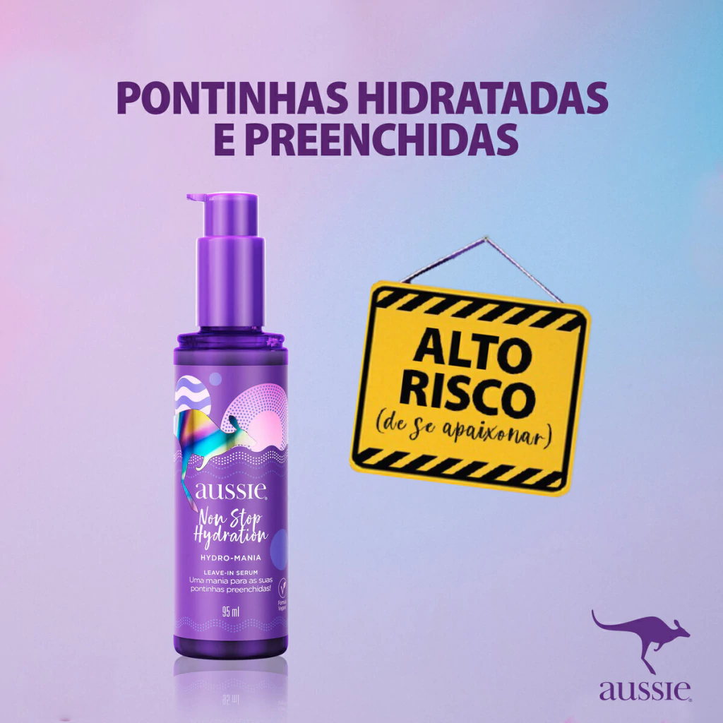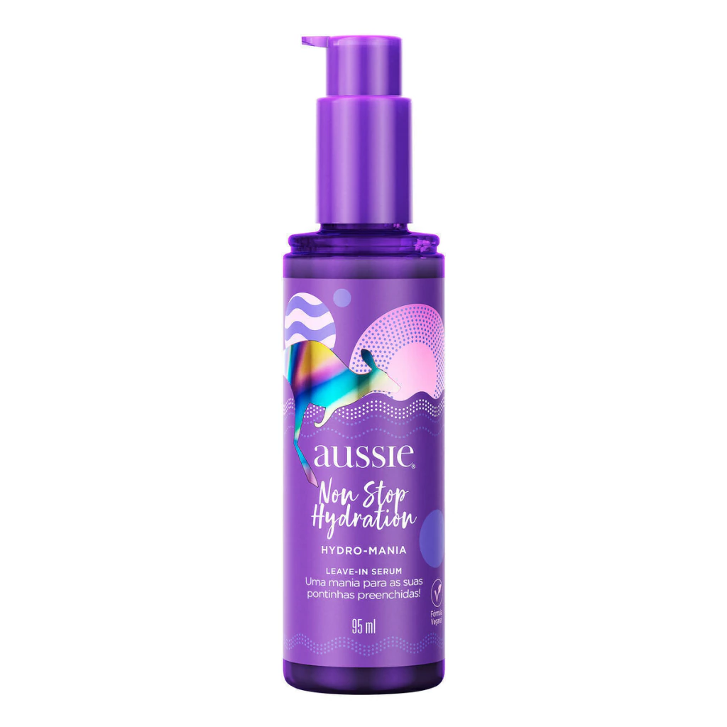 Cuidado: Serum Capilar com alto risco das suas pontinhas se apaixonarem (e você também)! O Non Stop Hydration Hydro-Mania é um leave-in sérum de tratamento que preenche e hidrata as pontinhas do seu cabelo instantaneamente e protege a hidratação. A fórmula do Serum é enriquecida com água de rosas, biotina e babosa e cria um creme ultraleve que ao entrar em contato com a mão se transforma em água, reduzindo o frizz e eliminando as pontas duplas, sem pesar no cabelo. O Leave-in ainda deixa o cabelo com aquele cheirinho de Aussie que todo mundo ama.Dicas para um efeito maravilhaussie:O Serum de Aussie é indicado para o uso diário no cabelo seco ou úmido1. Lave bem o seu cabelo com o seu Shampoo Aussie favorito. Repita até que sinta seu cabelo totalmente limpo.2. Aplique a máscara de tratamento intensivo 4EVER MASK do comprimento às pontas, massagendo mecha a mecha e deslizando as mãos no sentido do crescimento do cabelo. Deixe agir por 3 a 5 minutos e enxágue.3. Aplique o seu Condicionador Aussie favorito para selar as cuticulas e enxágue.4. Finalize com o Leave-In Sérum Hydro-Mania para pontinhas hidratadas e um efeito ainda mais duradouro.