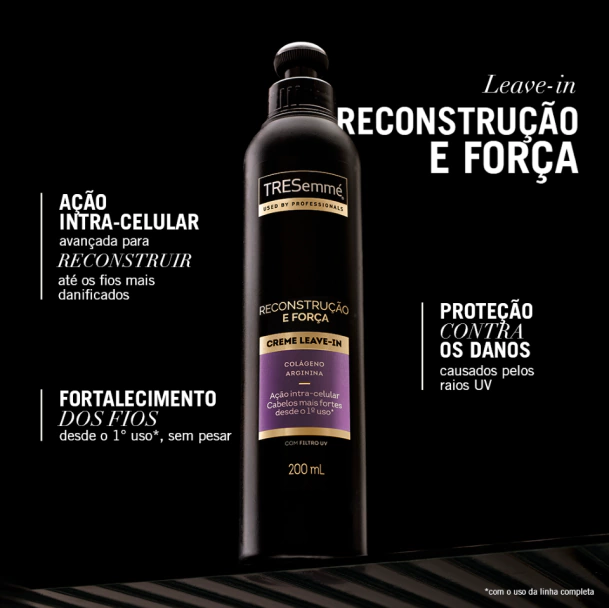 O creme de pentear leave-in Tresemmé Reconstrução e Força possui ação intra-celular avançada que proporciona um fortalecimento dos fios o 1° uso¹, sem pesar. Sua fórmula é enriquecida com colágeno e arginina para benefícios essenciais aos cabelos e conta com proteção contra danos causados pelos raios UV