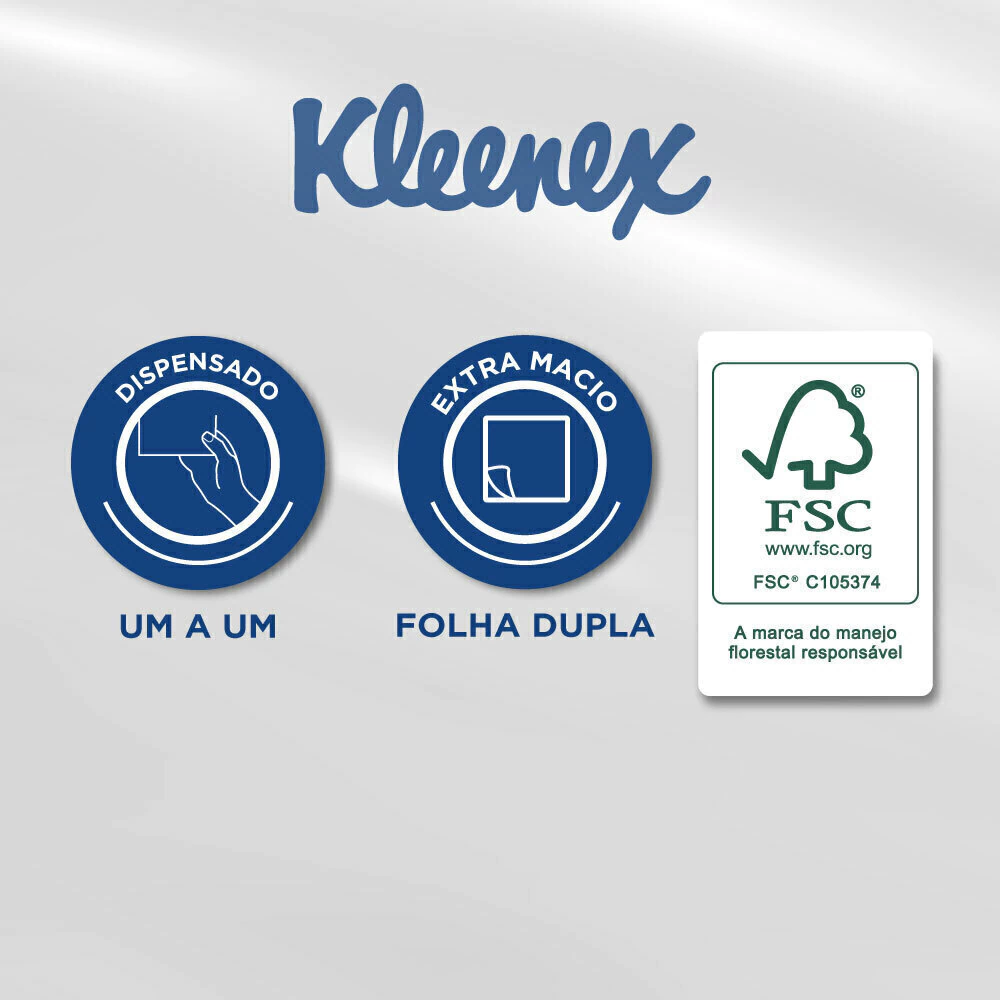 o Folha dupla para maior absorção em cada lencinho Kleenex. o Os Lenços Kleenex® são macios e com toque extra suave, oferecendo leveza em cada utilização. o Lenços picotados que saem com facilidade da caixa, evitando desperdício. o Caixa com a saída revestida com filme plástico, facilita o rasgo e o uso do lenço. o Produto certificado FSC® Forest Stewardship Council® (Conselho de Manejo Florestal) (FSC® C105374). Este produto utiliza matérias-primas de origem florestal proveniente de fontes responsáveis.