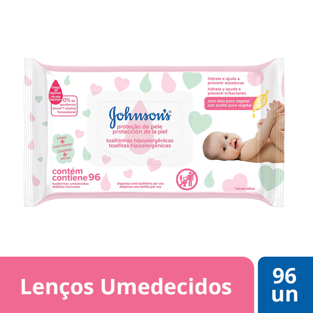 As toalhinhas JOHNSON'S® Proteção da pele limpam suavemente e removem 3x mais sujeiras*, ajudando a prevenir assaduras. *versus água e algodão