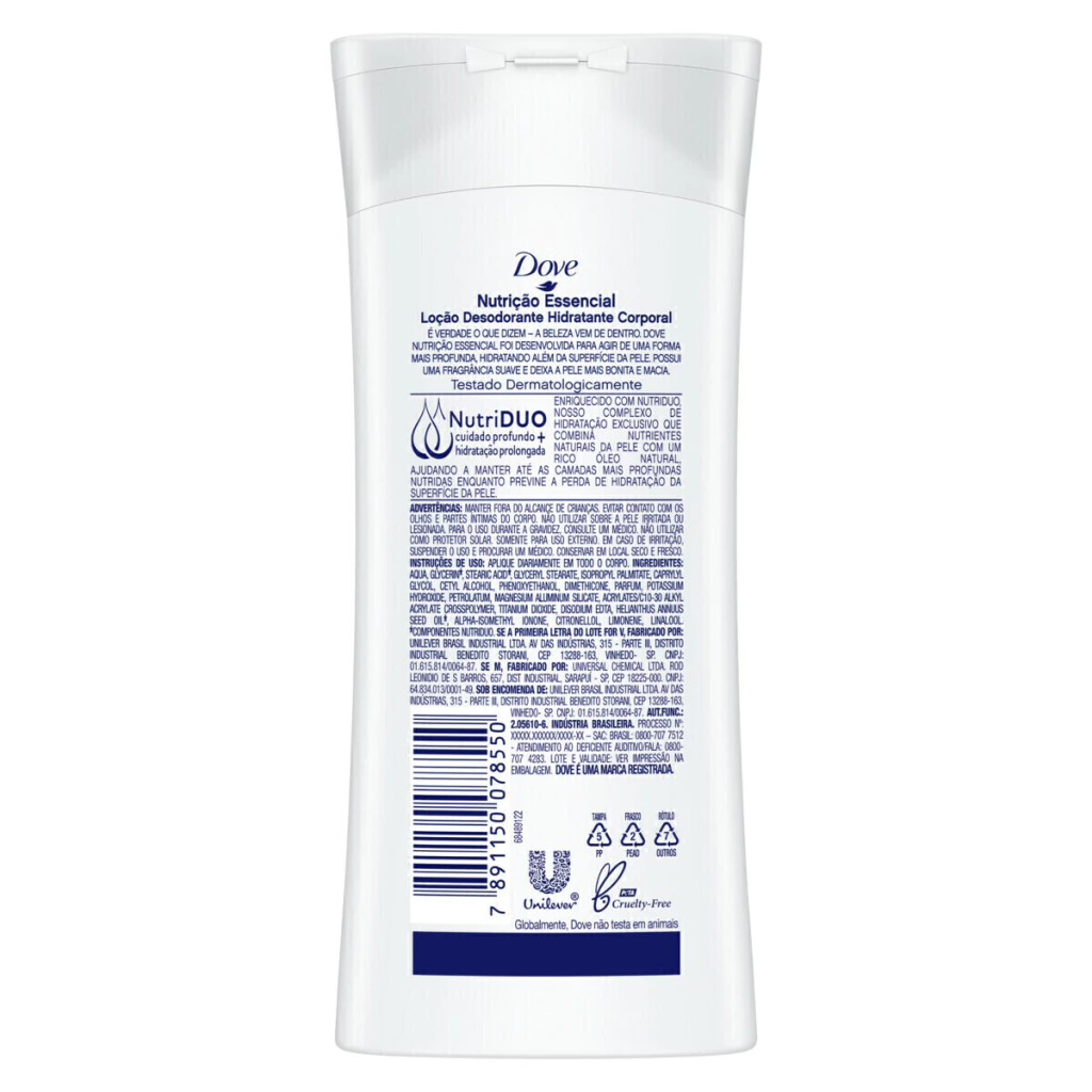 o A Loção Desodorante Hidratante Corporal Dove Nutrição Essencial é adequada para todos os tipos de pele o Esta loção desodorante hidratante corporal garante hidratação profunda por 72 horas o Com rápida absorção, essa loção desodorante hidratante corporal Dove nutre instantaneamente a pele o Dove nutrição essencial, além de deixar a pele mais macia e bonita, possui uma fragrância suave o Esta loção desodorante hidratante corporal é dermatologicamente testada o Enriquecida com NutriDUO, uma combinação de nutrientes naturais encontrados na pele